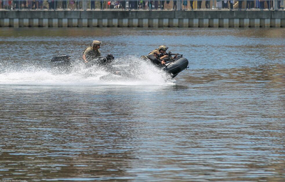 At the start of the demonstration, a hostage – Tampa Bay Mayor Bob Buckhorn – is taken from the Yacht StarShip and moved ashore to a small mock village overrun by the enemy. (Photo by Jen Judson/Defense News staff)A combat rubber raiding craft carrying special operators from Poland, Singapore and the U.S., inserts sub-surface swimmers near the yacht. The operators separated into two teams and moved underwater to positions on the bottom of the channel waiting to move in on the yacht and to eliminate an enemy sentry on the dock in front of the Tampa convention center. (Photo by Jen Judson/Defense News staff)An MH-60 Black Hawk helicopter with special operators from Colombia and the U.S. conduct a helocast insertion into the channel using a combat rubber raiding craft. (Photo by Jen Judson/Defense News staff)The MH-60 Black Hawk inserts a combat rubber raiding craft with a motor strapped to the bottom of the helicopter using a series of complex tie-downs. An operator jumps in the water, swims to the boat, and then mounts the engine, a very difficult task considering operators have to lift the engine into place while wearing all their gear. (Photo by Jen Judson/Defense News staff)Two MH-6 Little Bird helicopters carrying special operators establish a support-by-fire position as well as a sniper position overlooking the enemy camp in the village. Operators sit on external seats as the aircraft approaches the drop-off points. This allows the operators to quickly dismount and mount the helicopters as well as give them an unobstructed view of the battlefield. (Photo by Jen Judson/Defense News staff)Using intel that the hostage is still on the yacht, one of the dive teams emerge at the back of the vessel and begin a climb quietly up the side of the ship after a diversion is set off -- an explosion detonated on a small pontoon next to the yacht toward the front of the ship. (Photo by Jen Judson/Defense News staff)An MH-60 Black Hawk helicopter approaches the yacht with special operators from Colombia, Finland, Poland, Singapore, and the U.S. The helicopter assault force execute a fast-rope infiltration onto the yacht. Once on board, the assault force quickly secures the ship and begins searching for the hostage. (Photo by Jen Judson/Defense News staff)Discovering the hostage is not on the yacht, but ashore in the village, a boat assault force enters the scene aboard two Special Operations Craft – Riverine or SOC-R. This force consists of personnel from Colombia, Finland, Poland, and the U.S. and a member from the FBI. Their mission is to eliminate enemy resistance in the vicinity of the village, rescue the hostage, and gather valuable intelligence before departing the area. MH-6 Little Birds provide armed escort throughout the assault. (Photo by Jen Judson/Defense News staff)Special forces approach the shore where the hostage appears to be held, opening fire on the enemy as they approach. (Photo by Jen Judson/Defense News staff)Operators prepare to take the hostage aboard once rescued from the village. (Photo by Jen Judson/Defense News staff)A special operator prepares to kick down the door where he anticipates the hostage is being held following an explosion at the entrance. (Photo by Jen Judson/Defense News staff)Operators, including one from Finland, rescue the hostage – Mayor Buckhorn in a Tampa Bay Lightning jersey – and prepare to move him onto a watercraft to extract him from the village. The Tampa Bay Lightning went on to lose against the Washington Capitals in a home game during the Stanley Cup semi-finals later that night. (Photo by Jen Judson/Defense News staff)Once Buckhorn is brought aboard the vessel, a special operator continues to suppress enemy fire as the watercraft pulls away from the shore. (Photo by Jen Judson/Defense News staff)With the hostage secure, the commander orders all operators extracted from the area. Black Hawk helicopters return to exfiltrate the crew from the yacht using the Fast Rope Insertion and Extraction System or FRIES. This system is used for extracting personnel from areas where helicopters cannot land. Ropes are attached to the helicopter and dropped down to the personnel. A series of rings on the rope allow operators on the ground, wearing special harnesses, to clip onto the rope. (Photo by Jen Judson/Defense News staff)The Combat Rubber Raiding Craft returns to the channel where the swimmers are extracted by a Black Hawk helicopter using a caving ladder. The helicopter will typically hover about 10 feet above the water while the personnel climb the ladder. (Photo by Jen Judson/Defense News staff)To cap off the demonstration, a C-130 flies overheard with a military free-fall parachute jump team. This 7-man team, with jumpers from Colombia, Hungary, Italy, Romania, Singapore, and the United States, will jump from the aircraft at 8,000 feet and deploy their parachutes at 4,000 feet. (Photo by Jen Judson/Defense News staff)A member of the jump team prepares to land in the water below. While done in the broad daylight during the demonstration, the team normally conducts military free-fall operations in the dead of night, while fully loaded with 70 pounds of combat equipment, and wearing a special helmet and oxygen mask. (Photo by Jen Judson/Defense News staff)Each team member drops into the water roughly in the same spot, a challenging maneuver when having to wrangle a parachute. (Photo by Jen Judson/Defense News staff)
