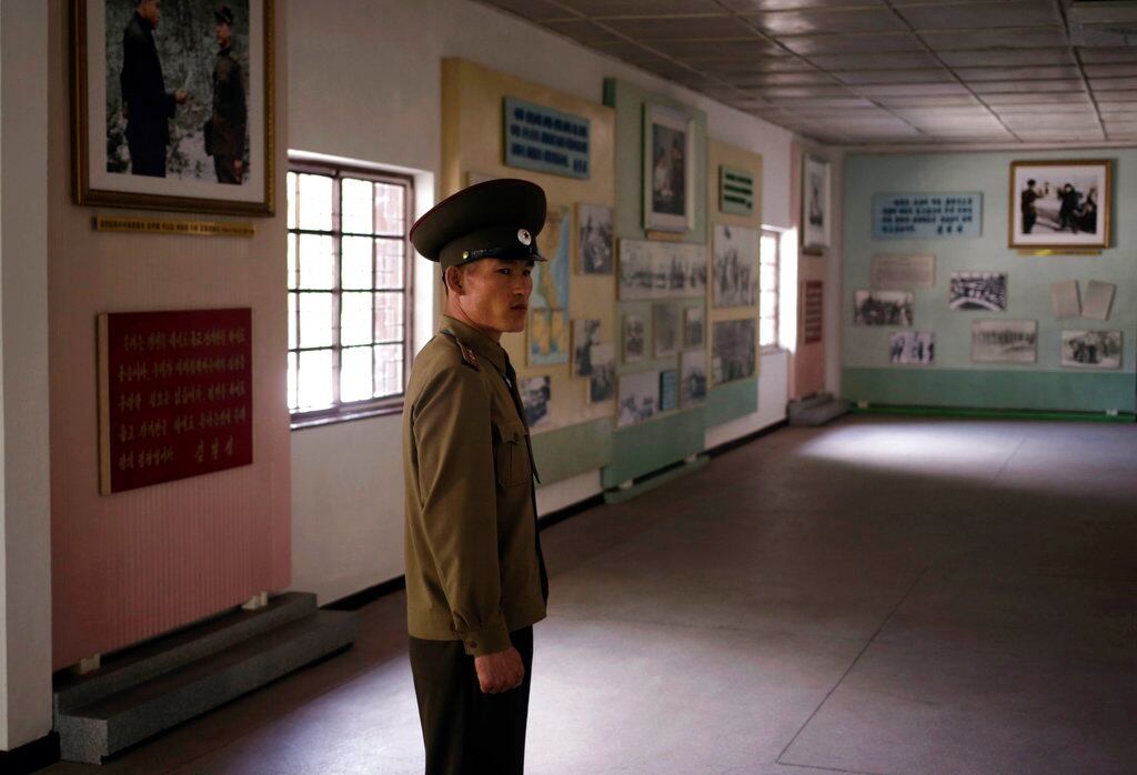North Korean Army Lt. Colonel Hwang Myong Jin stands inside the museum of the armistice agreement between North and South Korea at the truce village at the Demilitarized Zone (DMZ) which separates the two Koreas in Panmunjom, North Korea, Wednesday, June 20, 2018. Hwang, who has been a guide on the northern side of the Demilitarized Zone that divides the two Koreas for five years, says that since the summits between North Korean leader Kim Jong Un and the presidents of South Korea and the United States, things have quieted down noticeably in perhaps the most iconic symbol of the one last place on Earth where the Cold War still burns hot. (Dita Alangkara/AP)