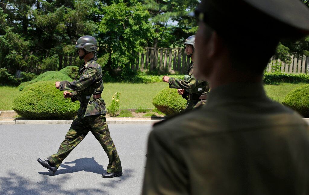 A North Korean soldier marches at the truce village at the Demilitarized Zone (DMZ) which separates the two Koreas in Panmunjom, North Korea, Wednesday, June 20, 2018. Since the summits between North Korean leader Kim Jong Un and the presidents of South Korea and the United States, things have quieted down noticeably in perhaps the most iconic symbol of the one last place on Earth where the Cold War still burns hot. (Dita Alangkara/AP)