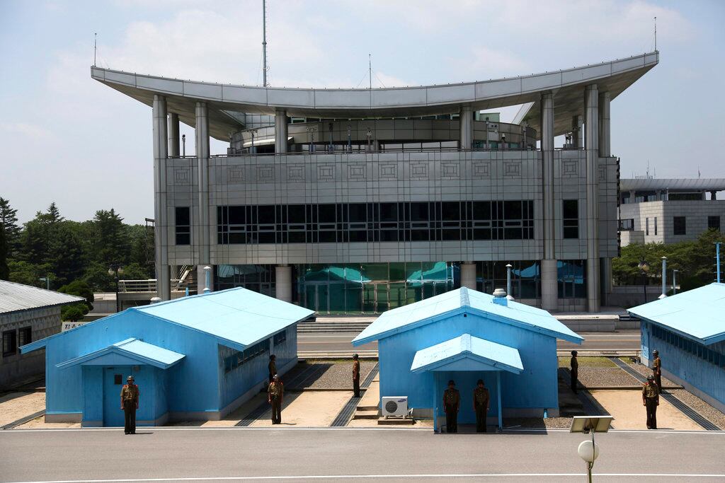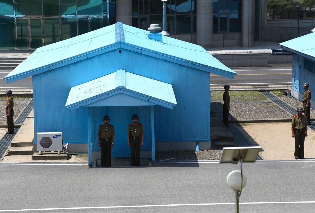 North Korean soldiers stand guard at the truce village at the Demilitarized Zone (DMZ) which separates the two Koreas in Panmunjom, North Korea, Wednesday, June 20, 2018. (Dita Alangkara/AP)