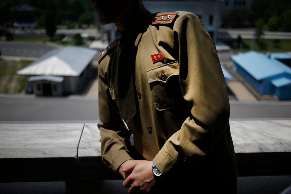 North Korean Army Lt. Colonel Hwang Myong Jin wears a pin of late North Korean leaders Kim Il Sung and his son Kim Jong Il while explaining the history of the truce village at the Demilitarized Zone (DMZ) which separates the two Koreas in Pammunjom, North Korea, Wednesday, June 20, 2018. Hwang who has been a guide on the northern side of the Demilitarized Zone that divides the two Koreas for five years says that since the summits between North Korean leader Kim Jong Un and the presidents of South Korea and the United States, things have quieted down noticeably in perhaps the most iconic symbol of the one last place on Earth where the Cold War still burns hot. (Dita Alangkara/AP)