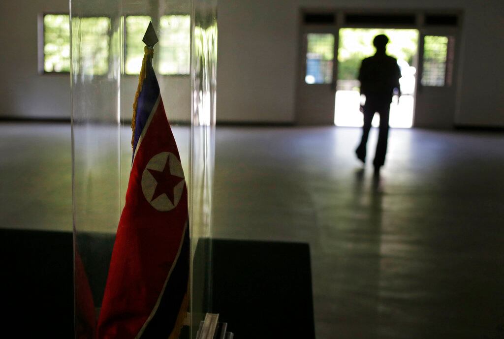 A North Korean soldier is silhouetted in the background while the national flag is displayed at the museum of the armistice agreement between North and South Korea at the truce village of Panmunjom at the Demilitarized Zone (DMZ) which separates the two Koreas in Panmunjom, North Korea, Wednesday, June 20, 2018. (Dita Alangkara/AP)