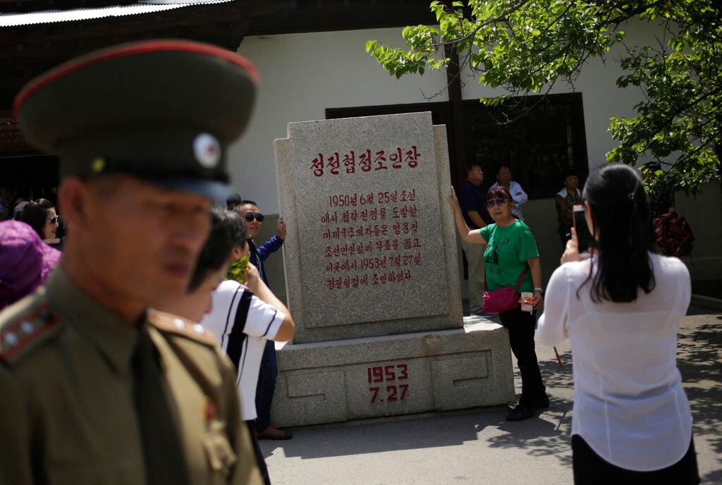 Chinese tourists have their photos taken outside the museum of the armistice agreement between North and South Korea at the truce village of Panmunjom at the Demilitarized Zone (DMZ) which separates the two Koreas in Panmunjom, North Korea, Wednesday, June 20, 2018. (Dita Alangkara/AP)