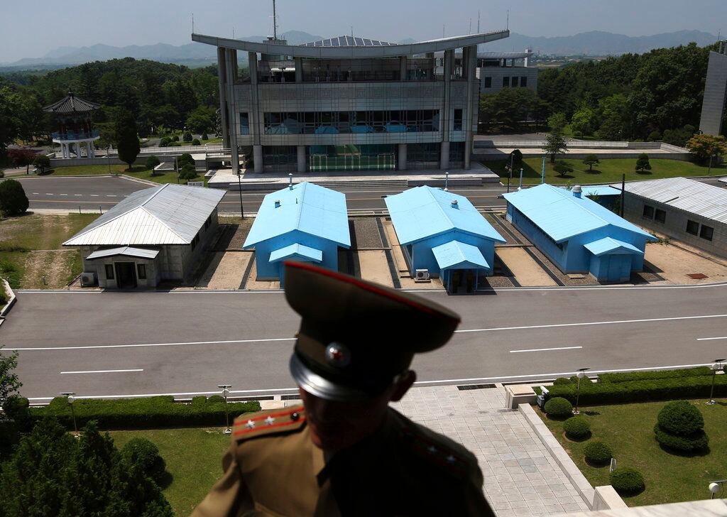A South Korean building complex is seen in the background as North Korean soldiers guard the truce village at the Demilitarized Zone (DMZ) which separates the two Koreas in Panmunjom, North Korea, Wednesday, June 20, 2018. A tour guide Hwang Myong Jin, on the northern side of the Demilitarized Zone that divides the two Koreas, says that since the summits between North Korean leader Kim Jong Un and the presidents of South Korea and the United States, things have quieted down noticeably in perhaps the most iconic symbol of the one last place on Earth where the Cold War still burns hot. (Dita Alangkara/AP)