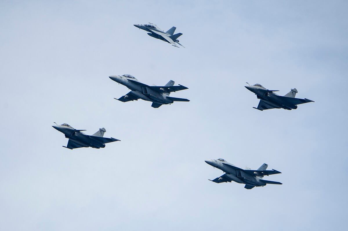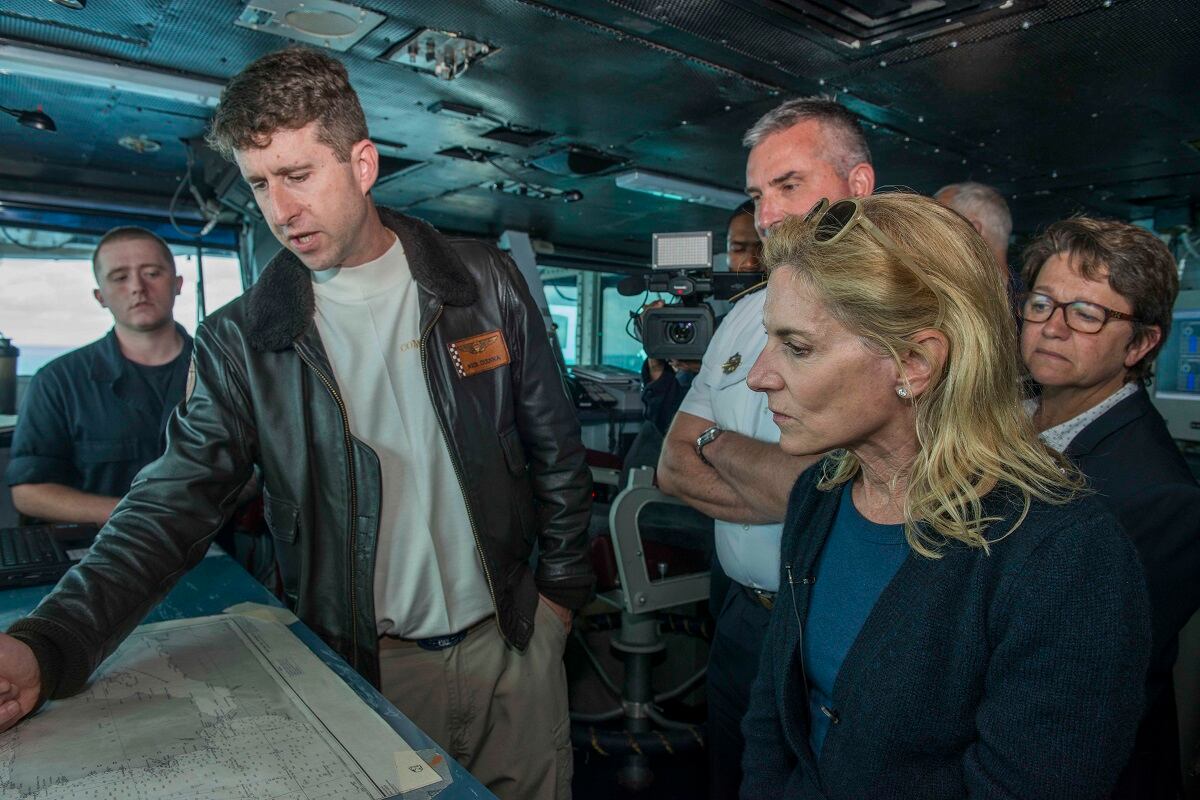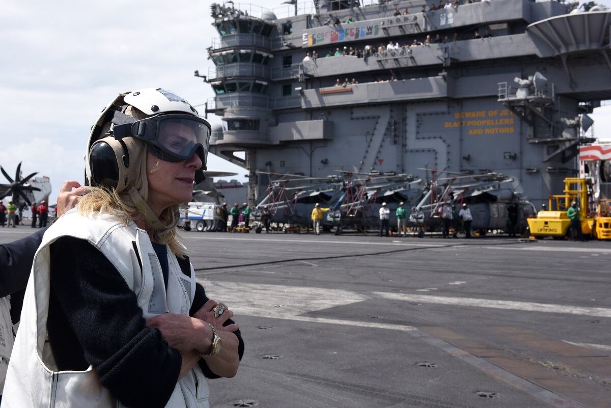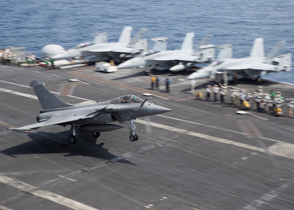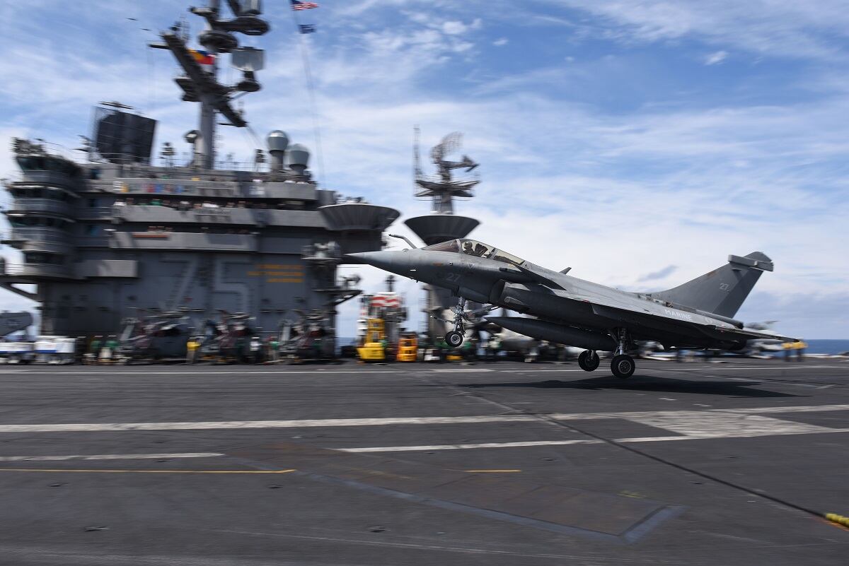 F/A-18 Super Hornets, assigned to Carrier Air Wing One, and French Dassault Rafale M fighters fly over the Nimitz-class aircraft carrier Harry S. Truman. Truman is deployed as part of an ongoing rotation of U.S. forces supporting maritime security operations in international waters around the globe. (U.S. Navy)Truman's commanding officer, Capt. Nicholas Dienna, left, shows U.S. ambassador to the French Republic and Principality of Monaco Jamie McCourt the aircraft carrier's position on a chart on the bridge. (U.S. Navy)A French Dassault Rafale M fighter touches down on the flight deck aboard the Nimitz-class aircraft carrier Harry S. Truman. (U.S. Navy)Jamie McCourt, U.S. ambassador to the French Republic and Principality of Monaco, observes flight operations aboard the Truman. (U.S. Navy)A French Dassault Rafale M fighter prepares to touch down on the flight deck of the Nimitz-class aircraft carrier Harry S. Truman. (U.S. Navy)