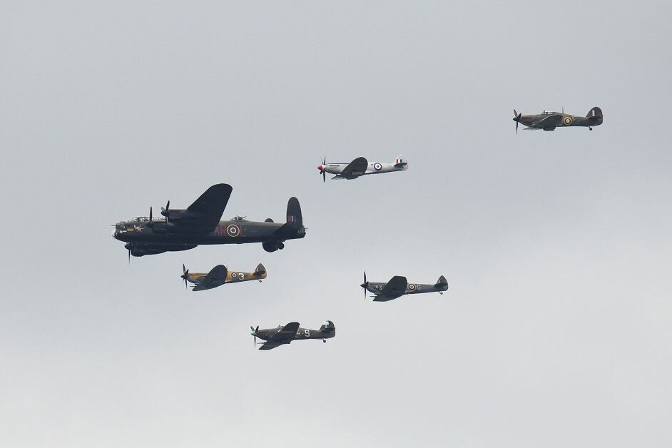 LONDON, ENGLAND - JULY 10: In this handout image provided by the Ministry of Defence, Typhoon aircraft forming "RAF100" over the Mall and Buckingham Palace during RAF 100 celebrations on July 10, 2018 in London, England. A centenary parade and a flypast of up to 100 aircraft over Buckingham Palace takes place today to mark the Royal Air Forces' 100th birthday. (Photo by Ministry of Defence via Getty Images)Royal Air Force (RAF) Chinooks from RAF Odiham flew in the lead formation, along with Pumas from RAF Benson, for the RAF100 flypast through London during RAF 100 celebrations. (Photo by Ministry of Defence via Getty Images)LONDON, ENGLAND - JULY 10: In this handout image provided by the Ministry of Defence, a trio of F-35B Lightning II aircraft of 617 Squadron taking part in the RAF100 parade and flypast over Buckingham Palace during RAF 100 celebrations on July 10, 2018 in London, England. A centenary parade and a flypast of up to 100 aircraft over Buckingham Palace takes place today to mark the Royal Air Forces' 100th birthday. (Photo by Ministry of Defence via Getty Images)A Second World War Lancaster bomber and Spitfires fly in formation on the centenary of the formation of the RAF on the eighth day of the 2018 Wimbledon Championships at The All England Lawn Tennis Club in Wimbledon, southwest London, on July 10, 2018. (OLI SCARFF/AFP/Getty Images)Military aircraft form a tight formation over the Queen Victoria Memorial (QVM) on the Mall outside Buckingham Palace in London. The Queen and members of the royal family took part a series of engagements on July 10 to mark the centenary of the Royal Air Force. (TOLGA AKMEN/AFP/Getty Images)The Red Arrows take part in a fly-past over Buckingham Palace, leaving colorful smoke trails. Photo by Paul Grover - WPA Pool/Getty Images)The Royal Air Force Aerobatic Team joins the nearly 100 other planes in marking a century of RAF service. (Photo by Ministry of Defence via Getty Images)