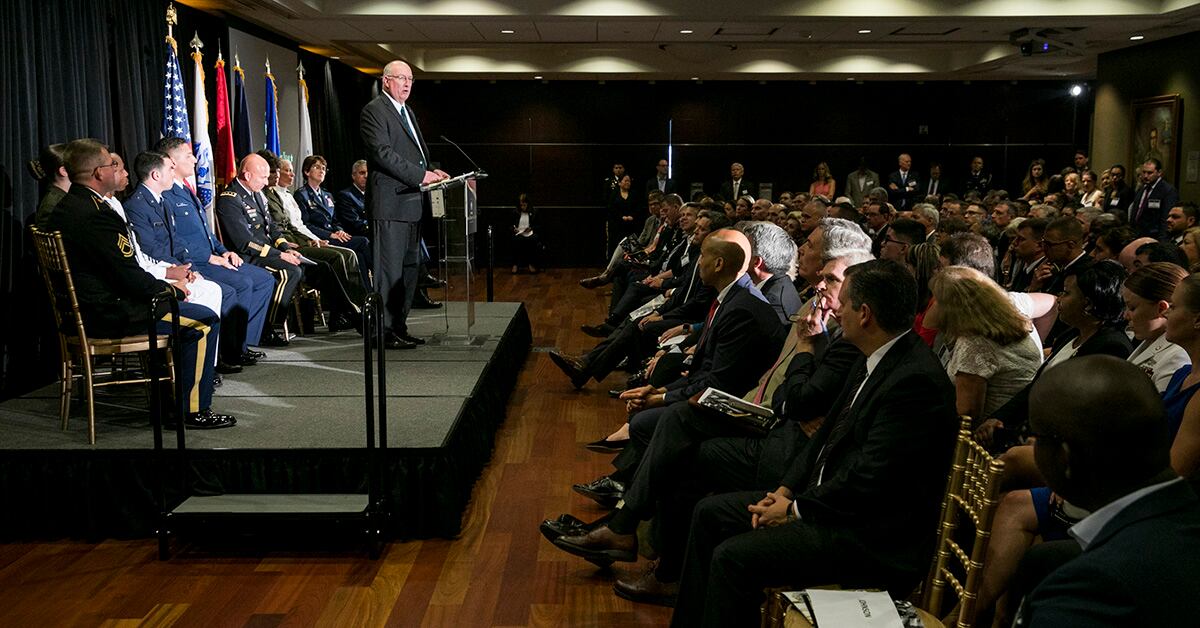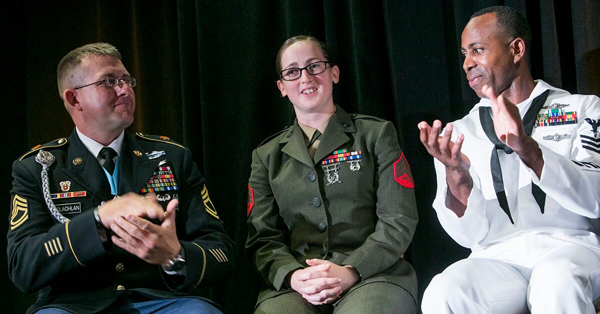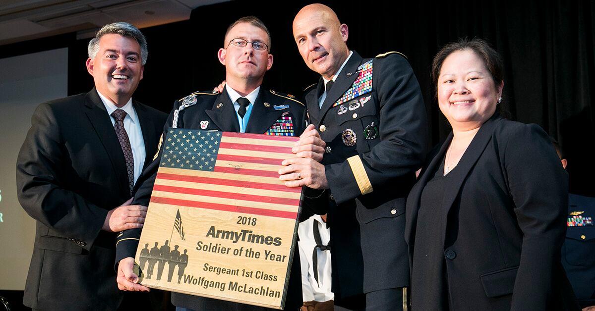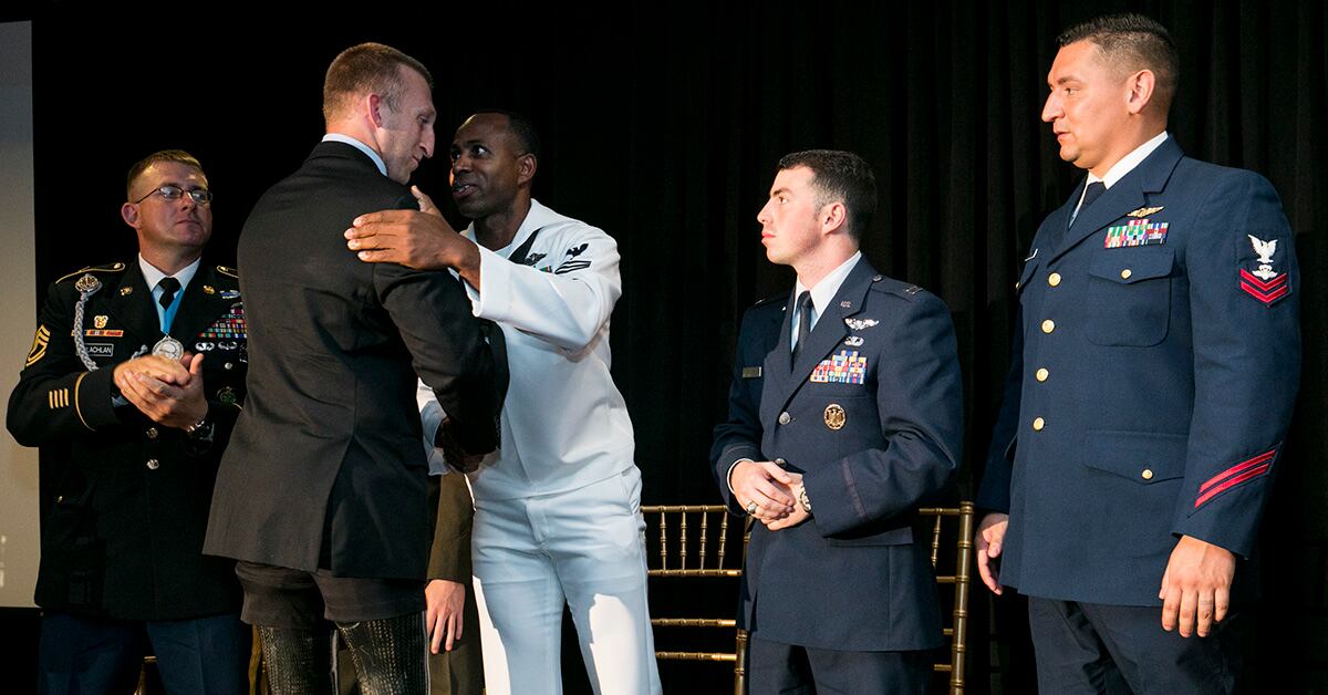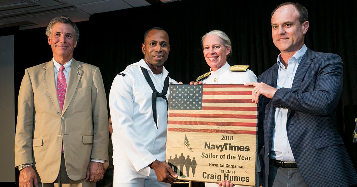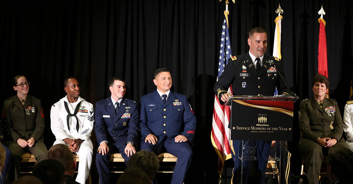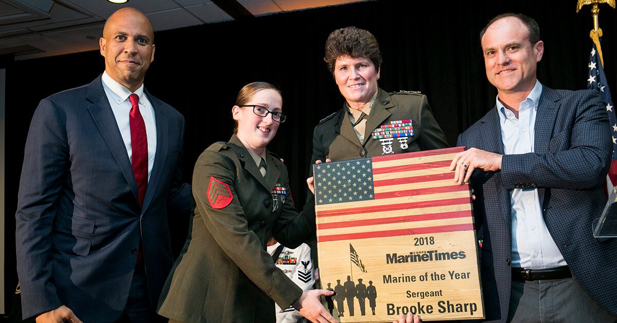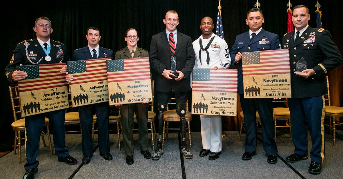 Commander, U.S. Marine Corps Forces Cyber Command and Military Times Executive Editor Andrew Tilghman, right during the Military Times Service Member of the Year awards ceremony held at the Reserve Officers Association in Washington DC on July 11, 2018. (Kristoffer Tripplaar/for Military Times)Sgt. 1st Class Wolfgang McLachlan, Army Times Soldier of the Year, left, Sgt. Brooke Sharp, Marine Corps Times Marine of the Year, center, and Hospital Corpsman 1st Class Craig Humes, Navy Times Sailor of the Year, right, during the Military Times Service Member of the Year awards ceremony held at the Reserve Officers Association in Washington DC on July 11, 2018. (Kristoffer Tripplaar/for Military Times)Left to right: Sgt. 1st Class Wolfgang McLachlan, Army Times Soldier of the Year, Capt. Julian Gluck, Air Force Times Airman of the Year, Sgt. Brooke Sharp, Marine Corps Times Marine of the Year, Marine Sgt. Rob Jones (Ret.), Veteran of the Year, Hospital Corpsman 1st Class Craig Humes, Navy Times Sailor of the Year, Aviation Survival Technician 2nd Class Omar Alba, Navy Times Coast Guardsman of the Year and Maj. Steve Gagner, Military Times Reboot Camp Entrepreneur of the Year, hold their awards during the Military Times Service Member of the Year awards ceremony held at the Reserve Officers Association in Washington DC on July 11, 2018. (Kristoffer Tripplaar/for Military Times)