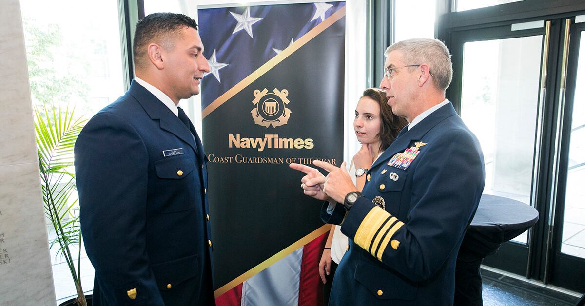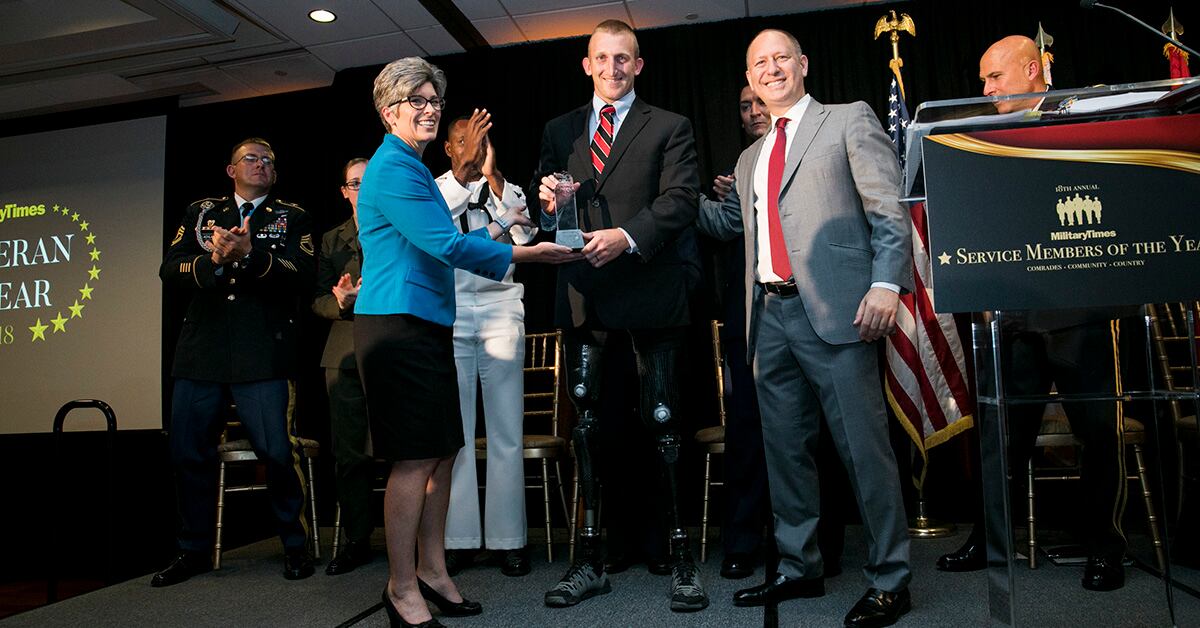 Deputy Commandant for Operations, U.S. Coast Guard and Andrew Tilghman, right, Executive Editor, Military Times during the Military Times Service Member of the Year awards ceremony held at the Reserve Officers Association in Washington DC on July 11, 2018.(Kristoffer Tripplaar/for Military Times)Marine Sgt. Rob Jones (Ret.), Veteran of the Year is presented with award by Sen. Joni Ernst (R-IA), left, and Mort Greenberg, right, during the Military Times Service Member of the Year awards ceremony held at the Reserve Officers Association in Washington DC on July 11, 2018. (Kristoffer Tripplaar/for Military Times)Rear Adm. Barry Black (Ret.), Chaplain of the U.S. Senate, says a prayer during the Military Times Service Member of the Year awards ceremony held at the Reserve Officers Association in Washington DC on July 11, 2018. (Kristoffer Tripplaar/FREELANCE for Marketing Dept)Sgt. 1st Class Wolfgang McLachlan, Army Times Soldier of the Year wore his Audie Murphy Club medal during the Military Times Service Member of the Year awards ceremony held at the Reserve Officers Association in Washington DC on July 11, 2018. (Alan Lessig/Staff)Sen. Joni Ernst (R-IA) speaks during the Military Times Service Member of the Year awards ceremony held at the Reserve Officers Association in Washington DC on July 11, 2018. ((Kristoffer Tripplaar/for Military Times)Rep. Tom Rice (R-SC) escorts Hospital Corpsman 1st Class Craig Humes, Navy Times Sailor of the Year, and he is presented his award from Vice Adm. Mary Jackson