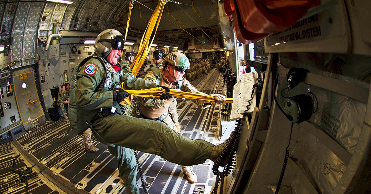 Air Force aircrew, assigned to the 15th Support Squadron, pull in the static lines after all jumpers have exited the aircraft during static line airborne training operations as part of during the Rim of the Pacific (RIMPAC) exercise. (MC Cynthia Z. De Leon/Released)
