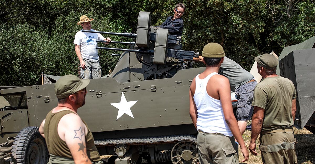 MAIDSTONE, ENGLAND - JULY 24: Historical reenactors climb aboard an American M16 Half-track as they take part in the annual War and Peace Revival show at Hop Farm Country Park on July 24, 2018 in Maidstone, England. The world's largest military vehicle show features historical re-enactments and a number of stalls selling war memorabilia, with a particular focus on World War II. (Jack Taylor/Getty Images)