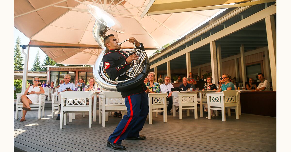 Cpl. Rafael J. Marin, musician, Marine Corps Base Quantico (MCBQ) Band, performs during a concert at Kesaheina, Mantyharju, Finland, July 29, 2018. The band continues to perform at different locations around Finland as they prepare for the 2018 Hamina Tattoo. (Cpl. Cristian L. Ricardo/Marines)