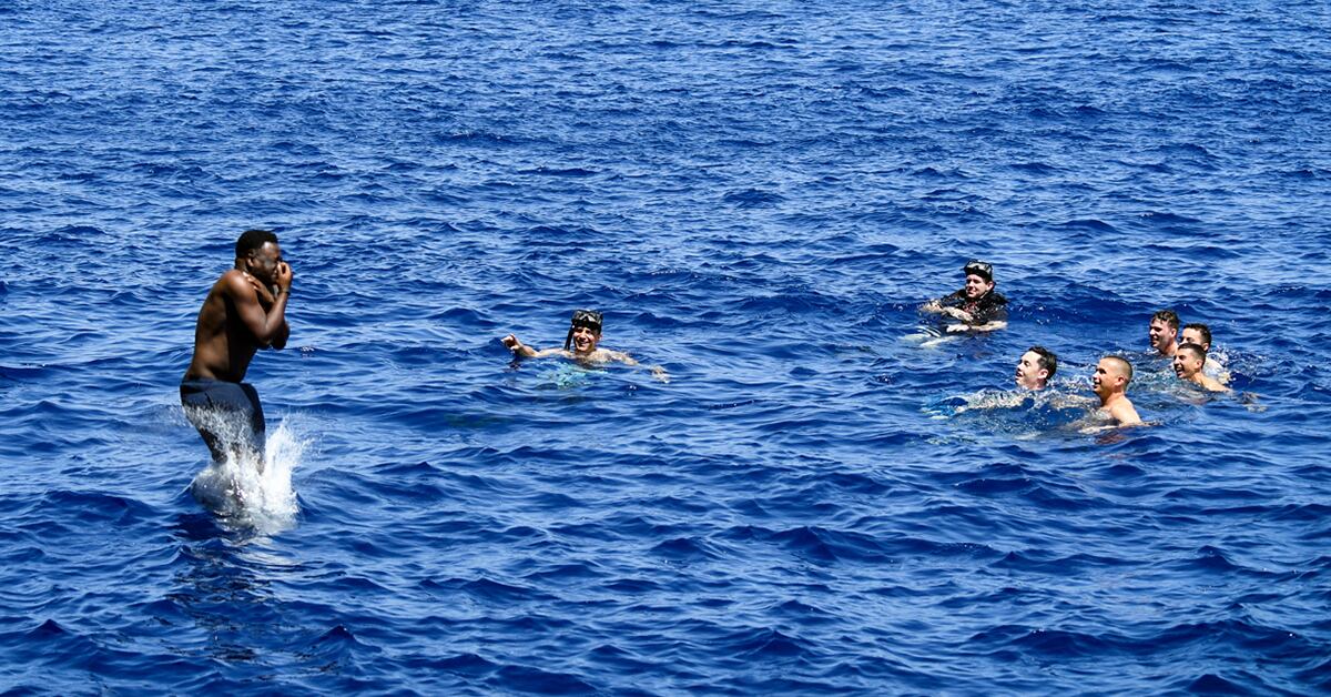 Electronics Technician 2nd Class Jonathan Green jumps into the water during a swim call aboard the Blue Ridge-class command and control ship USS Mount Whitney (LCC 20) in the Mediterranean Sea, July 22, 2018. (MC1 Justin Stumberg/Navy)
