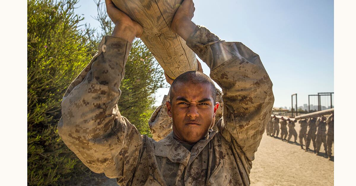 Recruits with India Company, 3rd Recruit Training Battalion, carry logs during a log drill exercise at Marine Corps Recruit Depot San Diego, July 23rd as part of their physical training. (Lance Cpl. Christian Garcia/Marines)