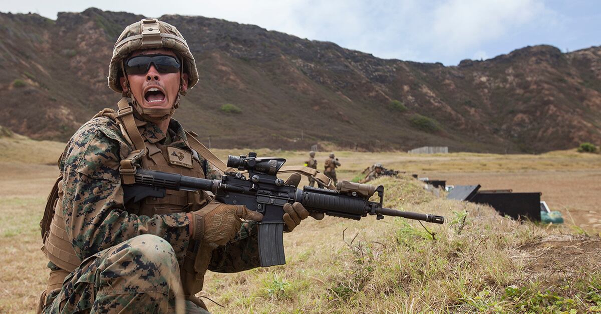 Marine Lance Cpl. Wyatt Prettyman, a squad leader with Lima Company, 3rd Battalion, 3rd Marine Regiment, III Marine Expeditionary Force, yells commands during a fire team assault at the Kaneohe Bay Range Training Facility, Marine Corps Base Hawaii, July 26, 2018. Marines with India, Kilo and Limo Company worked together to improve their communication, leadership and lethality as a fire team. (Sgt. Jesus Sepulveda Torres/Marines)