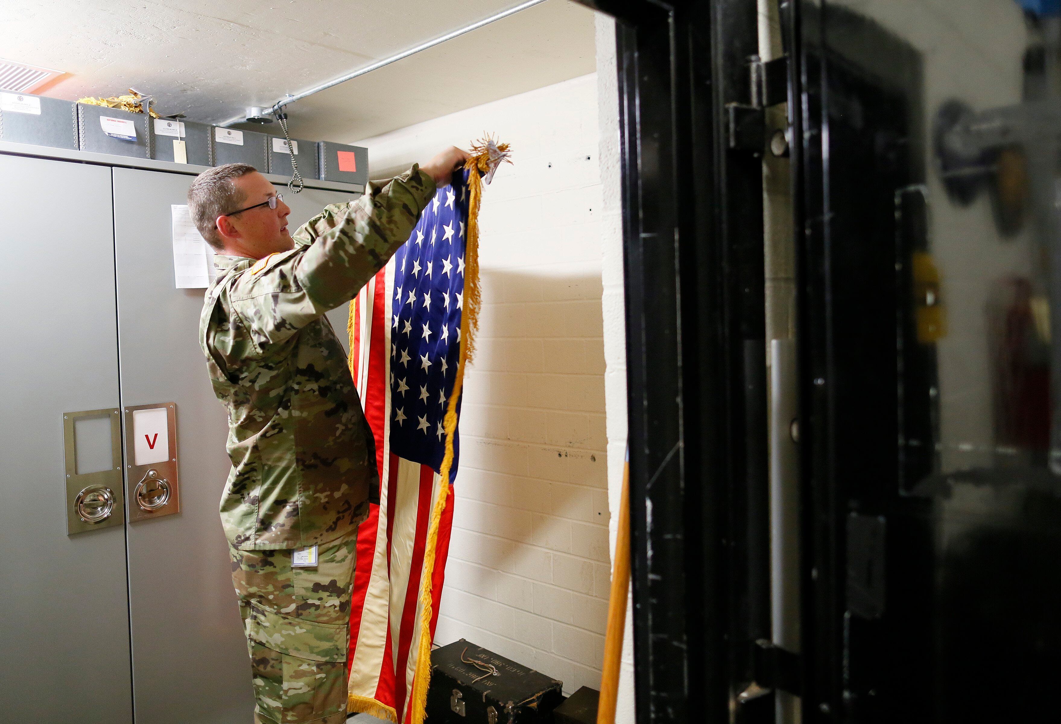 In this July 17, 2018, photo, Sgt. 1st Class Josh Mann, the Ohio Army National Guard historian, rolls an American flag that had been hanging in the temperature and humidity-controlled vault inside the Beightler Armory in Columbus, Ohio. The Ohio National Guard is celebrating its 230 years of service. (Adam Cairns/The Columbus Dispatch via AP)