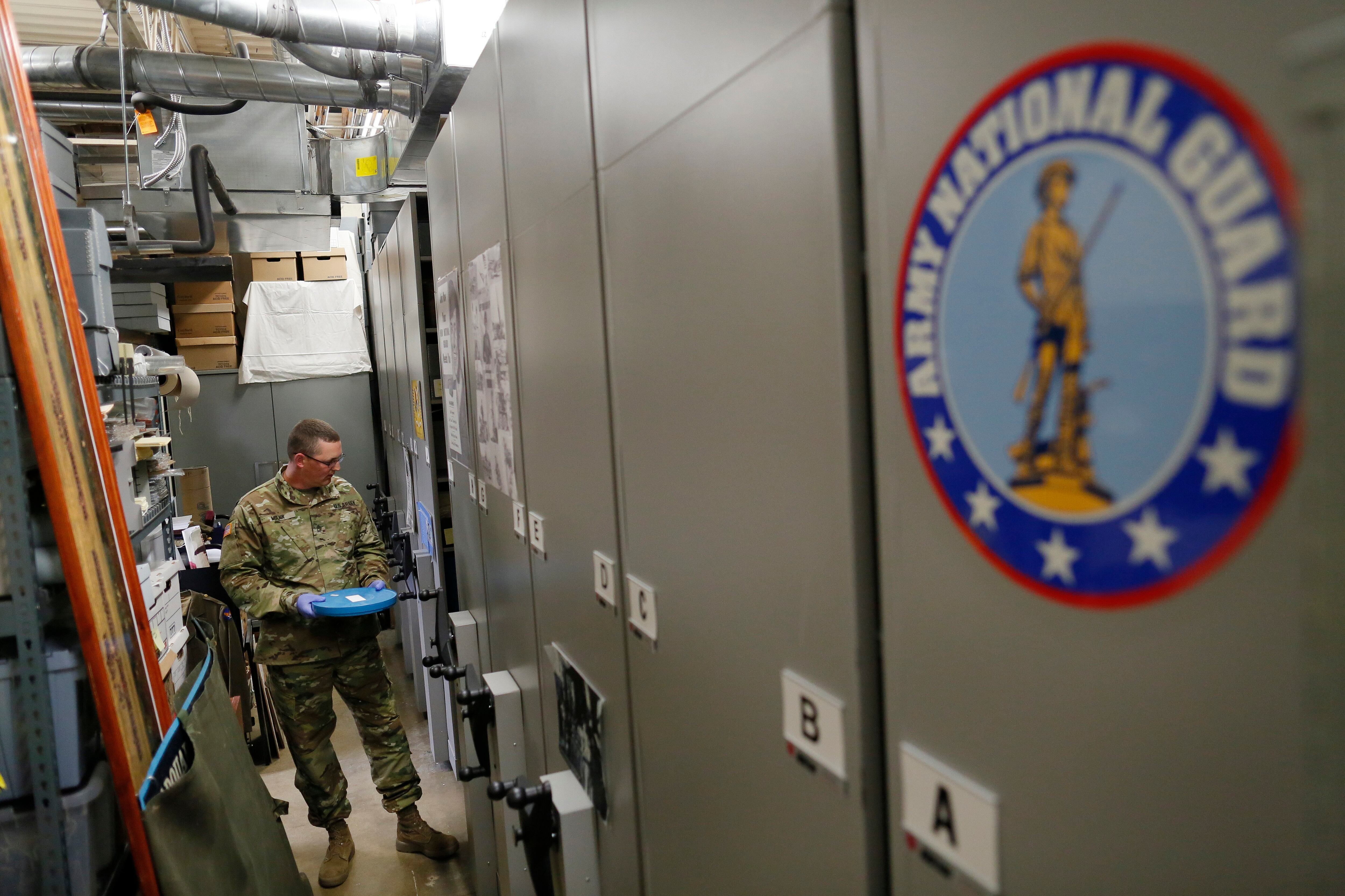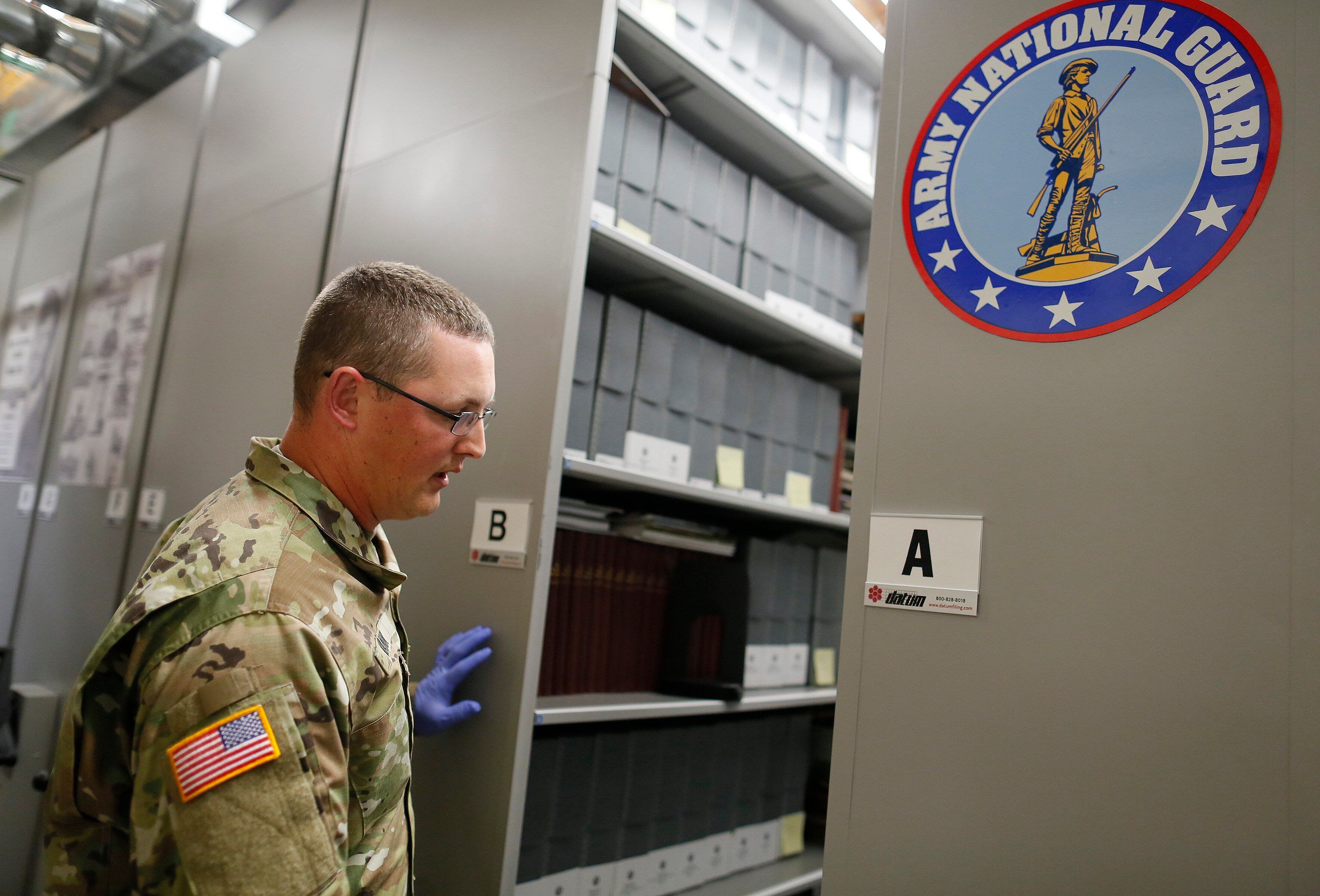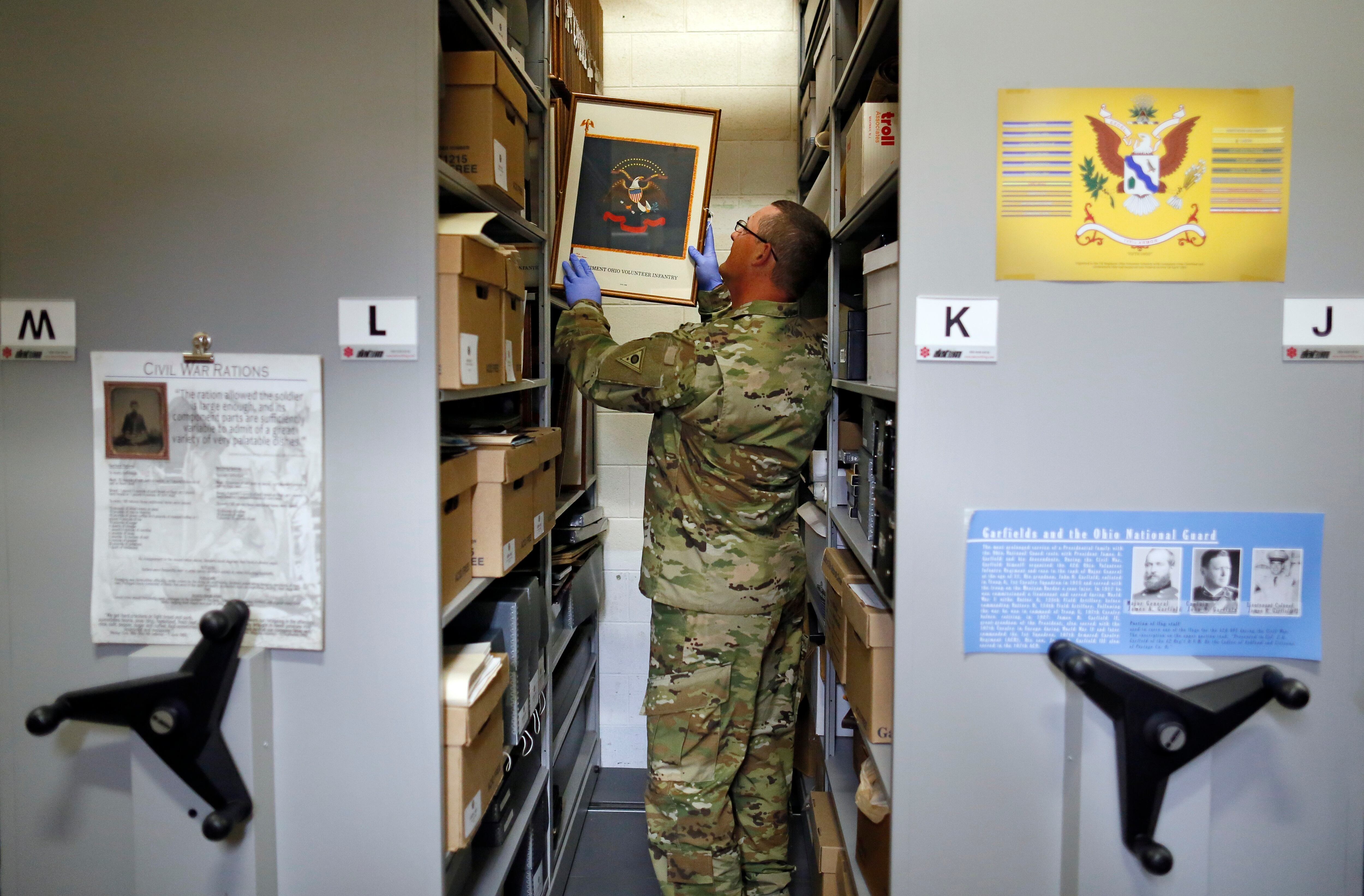 In this July 17, 2018, photo, Sgt. 1st Class Josh Mann, the Ohio Army National Guard historian, files away an artist's rendering of an infantry battle flag inside the Beightler Armory in Columbus, Ohio. The Ohio National Guard is celebrating its 230 years of service. (Adam Cairns/The Columbus Dispatch via AP)