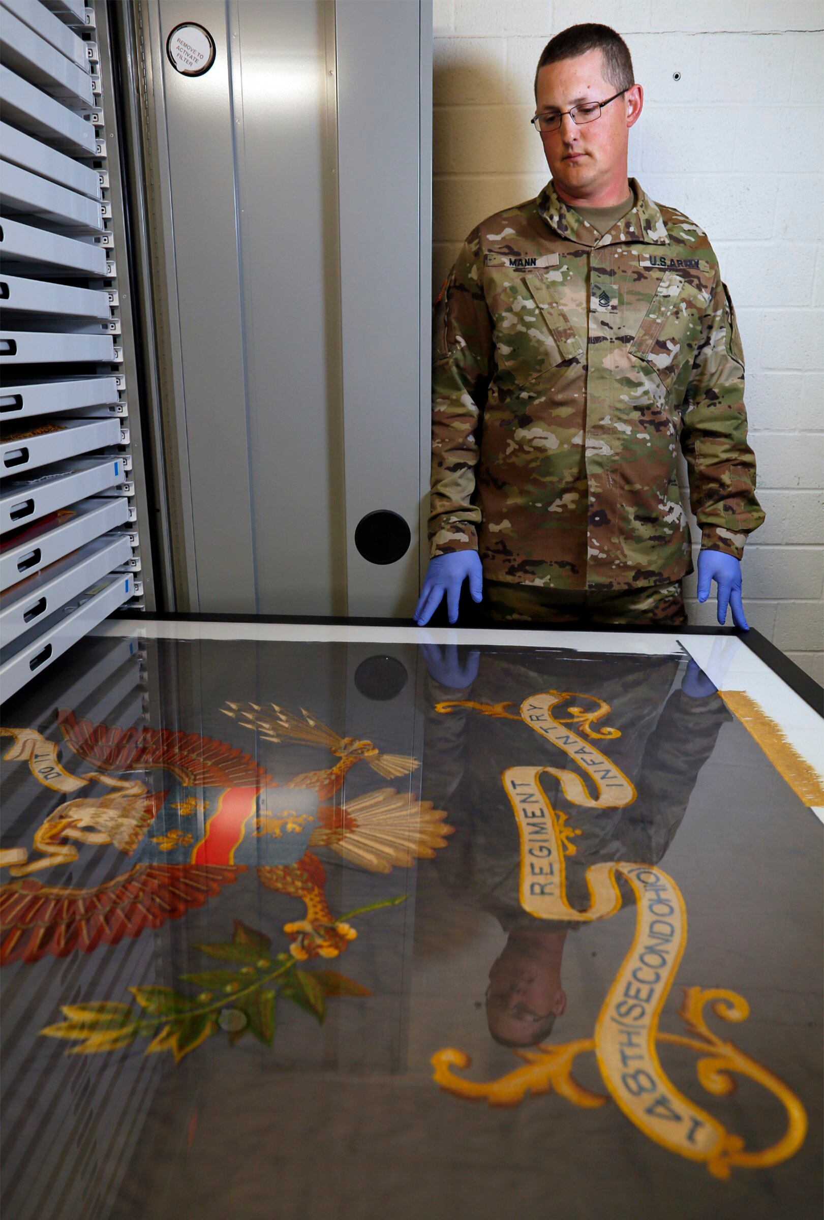 In this July 17, 2018, photo, Sgt. 1st Class Josh Mann, the Ohio Army National Guard historian, looks at a Civil War battle flag from the 148th Infantry Regiment inside the Beightler Armory in Columbus, Ohio. The Ohio National Guard is celebrating its 230 years of service. (Adam Cairns/The Columbus Dispatch via AP)