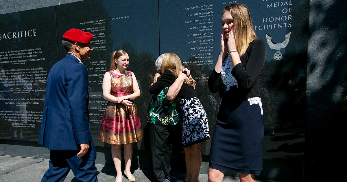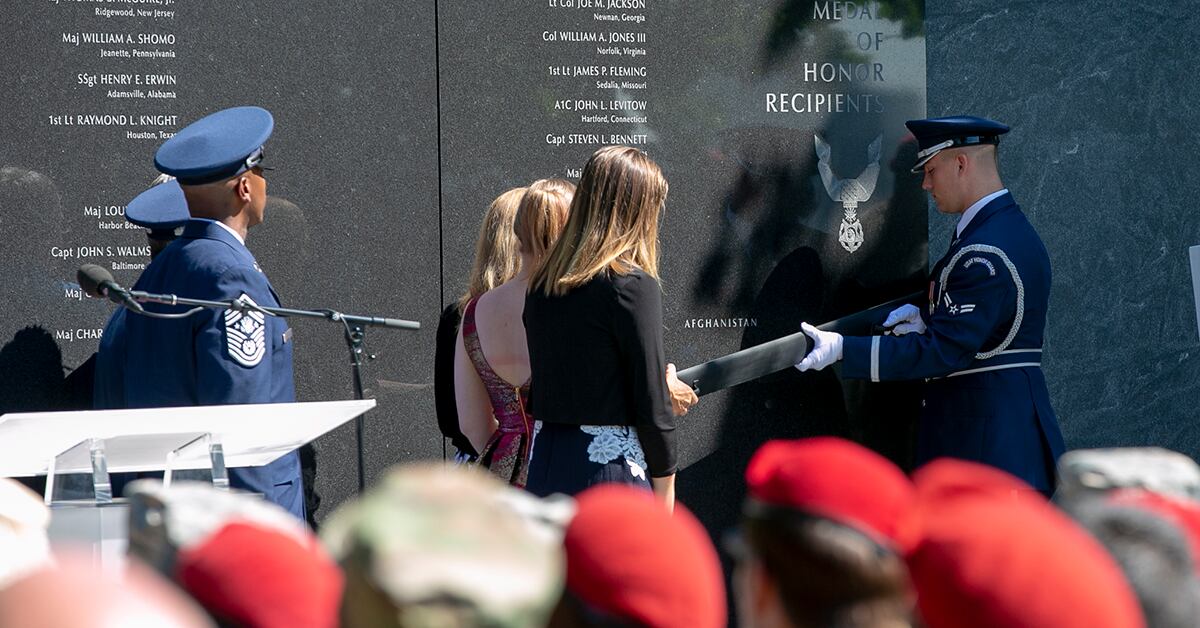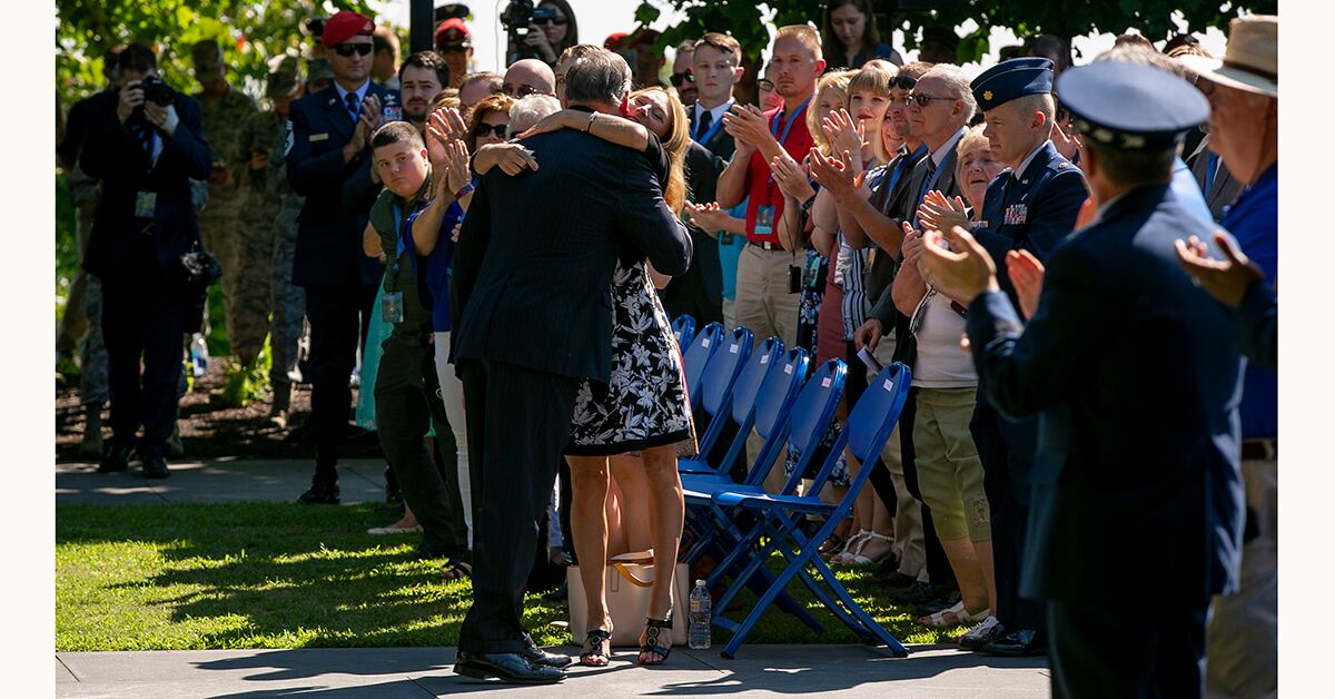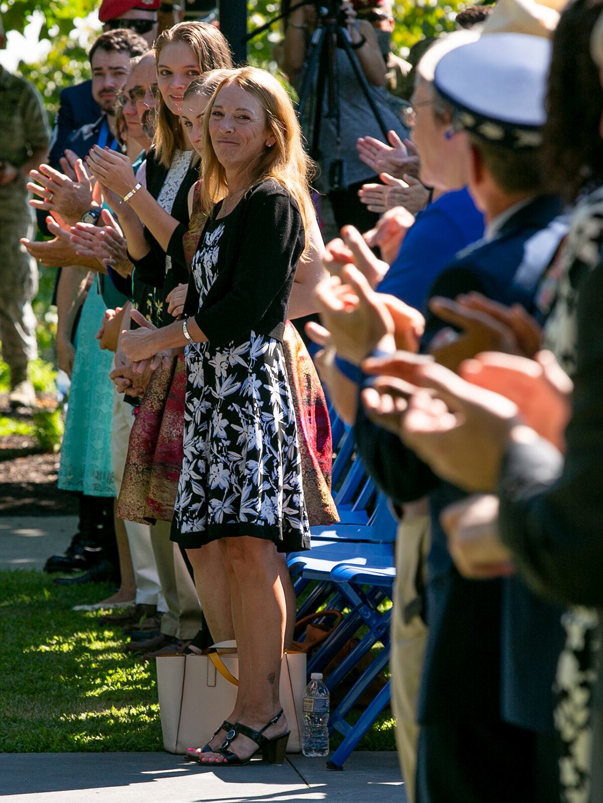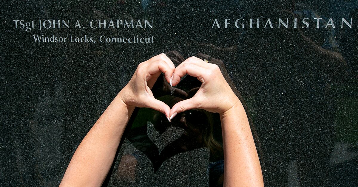 Family friend makes a heart next to the engraving for Technical Sgt. John Chapman, after his name was unveiled during a Medal of Honor ceremony at the Air Force Memorial Friday August 24, 2018. Chapman, was awarded the Medal of Honor Wednesday, for actions during a battle atop Takur Ghar mountain in Afghanistan on March 4, 2002. (Alan Lessig/Staff)Chapman's wife Valerie Nessel, his two daughters Brianna & Madison, and his mother, Terry Chapman, at left, during a Medal of Honor name unveiling ceremony at the Air Force Memorial for Air Force combat controller Technical Sgt. John Chapman, who was awarded the Medal of Honor on Wednesday for actions on Takur Ghar mountain in Afghanistan on March 4, 2002. (Alan Lessig/Staff)Hundreds of Airmen did pushups in honor of Air Force combat controller Technical Sgt. John Chapman after a Medal of Honor unveiling ceremony at the Air Force Memorial. Chapman, who was posthumously awarded the Medal of Honor Wednesday. (Alan Lessig/Staff)An AC-130U Spooky gunship, MC-130H Combat Talon II and two CV-22 Osprey tiltrotor aircraft assigned to the 1st Special Operations Wing, Hurlburt Field, Florida, fly a missing man formation over the Air Force Memorial during a Medal of Honor unveiling ceremony for Air Force combat controller Technical Sgt. John Chapman, who was posthumously awarded the Medal of Honor on Wednesday. (Alan Lessig/Staff)Valerie Nessel, spouse of U.S. Air Force Tech. Sgt. John Chapman, Brianna and Madison Chapman, daughters of Chapman, wipes away tears during a Medal of Honor unveiling ceremony at the Air Force Memorial for Air Force combat controller Technical Sgt. John Chapman, who was posthumously awarded the MOH on Wednesday. (Alan Lessig/Staff)Valerie Nessel, spouse of U.S. Air Force Tech. Sgt. John Chapman, gets a big hug from Col. (ret.) John Carney during a Medal of Honor unveiling ceremony at the Air Force Memorial for Air Force combat controller Technical Sgt. John Chapman, who was posthumously awarded the MOH on Wednesday. (Alan Lessig/Staff)Valerie Nessel, spouse of U.S. Air Force Tech. Sgt. John Chapman, along with her daughters Brianna and Madison Chapman, blows a kiss during a Medal of Honor unveiling ceremony at the Air Force Memorial. Chapman was posthumously awarded the MOH on Wednesday for actions on Takur Ghar mountain in Afghanistan on March 4, 2002. (Alan Lessig/Staff)Valerie Nessel, spouse of U.S. Air Force Tech. Sgt. John Chapman, speaks during a Medal of Honor unveiling ceremony at the Air Force Memorial for her husband who was posthumously awarded the Medal of Honor on Wednesday for actions on Takur Ghar mountain in Afghanistan on March 4, 2002. (Alan Lessig/Staff)Valerie Nessel, spouse of U.S. Air Force Tech. Sgt. John Chapman, along with daughters Brianna and Madison, removes cover from her husband's engraved name during a Medal of Honor unveiling ceremony at the Air Force Memorial. Chapman, was posthumously awarded the MOH on Wednesday for actions on Takur Ghar mountain in Afghanistan on March 4, 2002. (Alan Lessig/Staff)Chapman's family and Airmen gather together for a photo after a Medal of Honor unveiling ceremony at the Air Force Memorial for Air Force combat controller Technical Sgt. John Chapman, who was posthumously awarded the Medal of Honor on Wednesday for actions on Takur Ghar mountain in Afghanistan on March 4, 2002. (Alan Lessig/Staff)Chief Master Sgt. of the Air Force Kaleth O. Wright, left, presents Valerie Nessel, spouse of U.S. Air Force Tech. Sgt. John Chapman, and his daughters Brianna and Madison Chapman, with a letter of promotion raising his rank to Master Sgt. during a Medal of Honor unveiling ceremony at the Air Force Memorial. Chapman, was posthumously awarded the Medal of Honor on Wednesday for actions on Takur Ghar mountain in Afghanistan on March 4, 2002. (Alan Lessig/Staff)Valerie Nessel, spouse of U.S. Air Force Tech. Sgt. John Chapman, during a Medal of Honor unveiling ceremony at the Air Force Memorial for her husband who was posthumously awarded the MOH on Wednesday. (Alan Lessig/Staff)Valerie Nessel, wife of Technical Sgt. John Chapman, hugs his mother, Terry Chapman, center, along with two daughters Brianna & Madison after his name was unveiled during a Medal of Honor ceremony at the Air Force Memorial on Friday August 24, 2018. Chapman, was posthumously awarded the Medal of Honor on Wednesday for actions on Takur Ghar mountain in Afghanistan on March 4, 2002. (Alan Lessig/Staff)Hundreds of Airmen did pushups in honor of Air Force combat controller Technical Sgt. John Chapman after a Medal of Honor unveiling ceremony at the Air Force Memorial. Chapman, who was posthumously awarded the Medal of Honor Wednesday for actions on Takur Ghar mountain in Afghanistan on March 4, 2002. (Alan Lessig/Staff)More than 600 Airmen, family and friends attend a Medal of Honor unveiling ceremony at the Air Force Memorial for Air Force combat controller Technical Sgt. John Chapman, who was posthumously awarded the Medal of Honor on Wednesday for actions on Takur Ghar mountain in Afghanistan on March 4, 2002. (Alan Lessig/Staff)Airmen hug after a Medal of Honor unveiling ceremony at the Air Force Memorial for Air Force combat controller Technical Sgt. John Chapman, who was awarded the MOH on Wednesday. (Alan Lessig/Staff)Col. (ret.) John Carney, considered the father of Air Force special tactics, gets emotional as he speaks during Tech. Sgt. John Chapman’s name unveiling ceremony at the Air Force Memorial, in Arlington, Va., Aug. 24, 2018. Chapman was posthumously awarded the Medal of Honor for actions on Takur Ghar mountain in Afghanistan on March 4, 2002.
