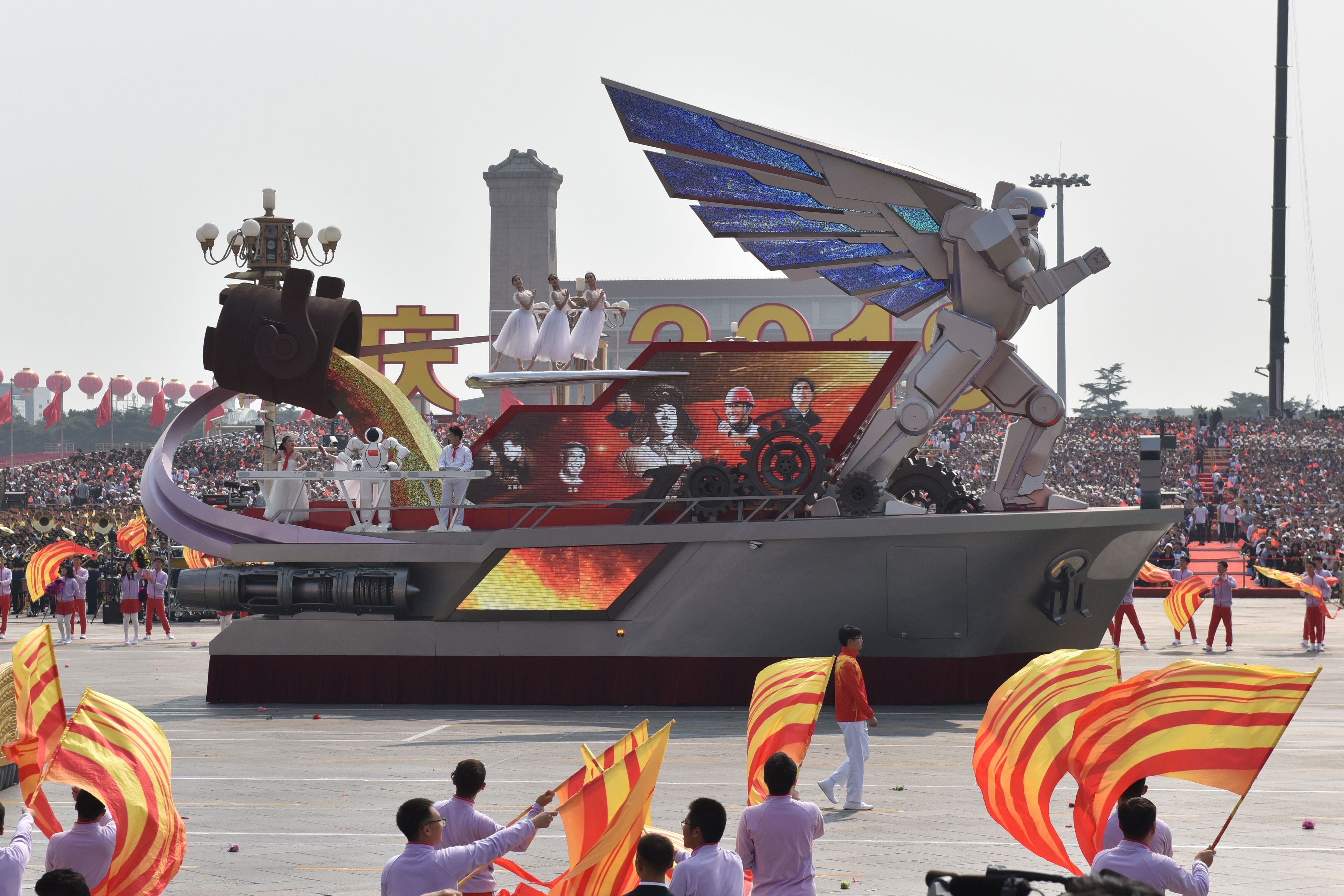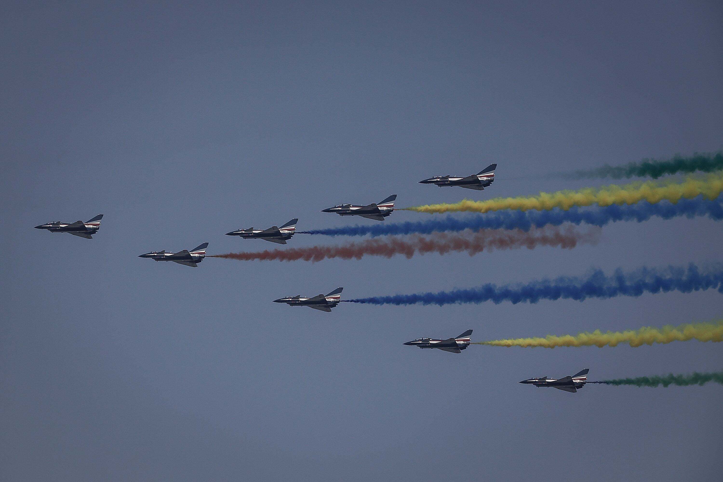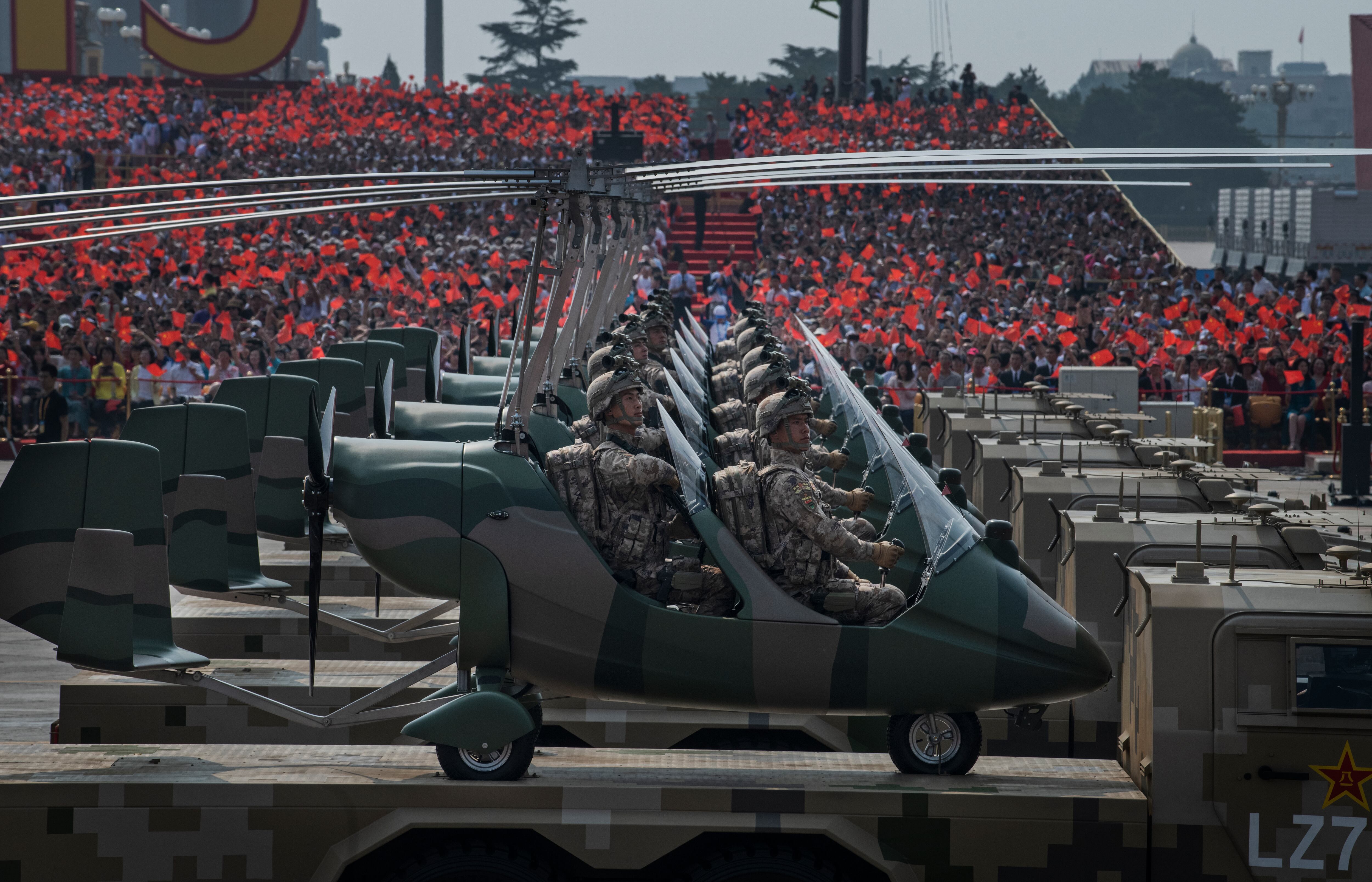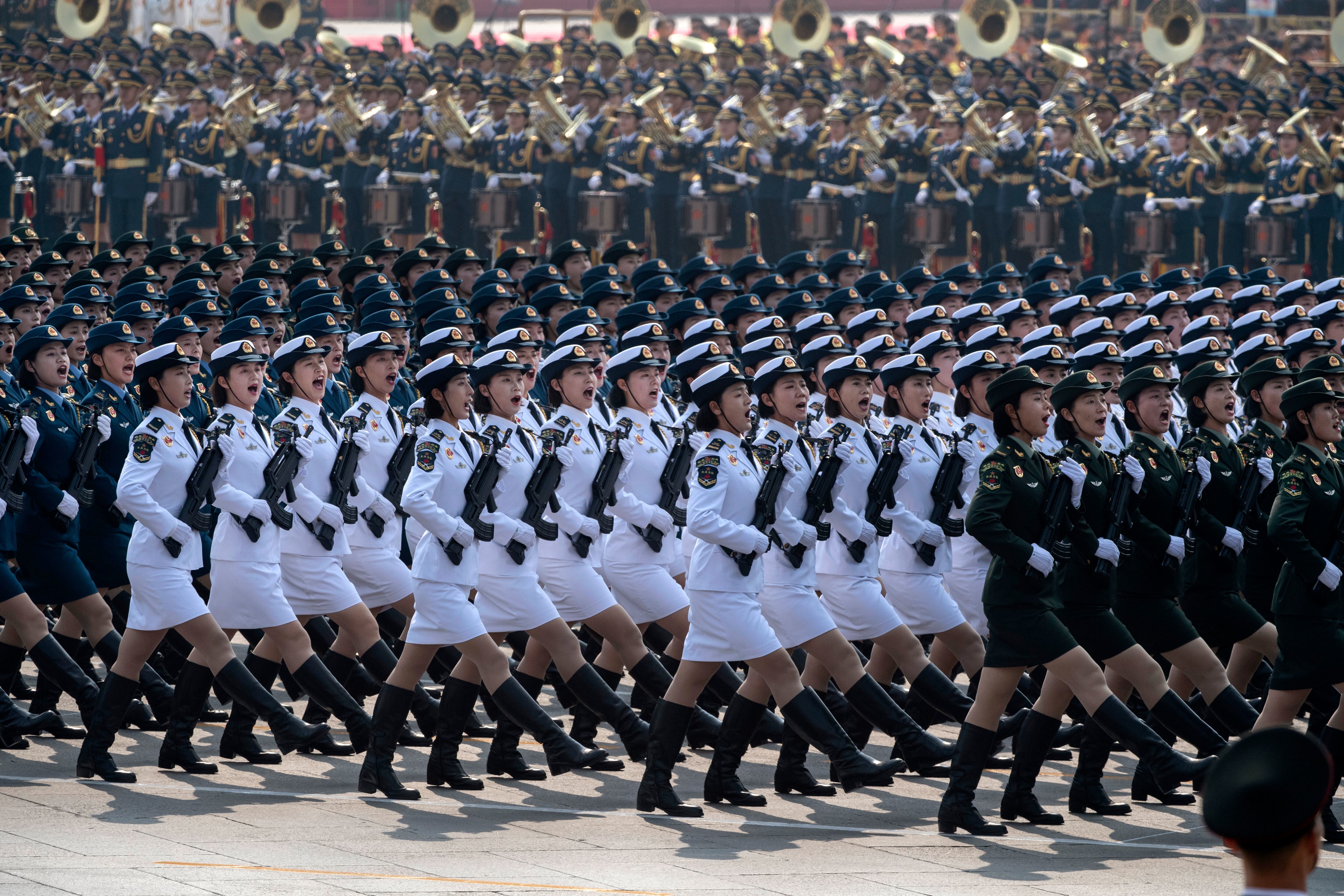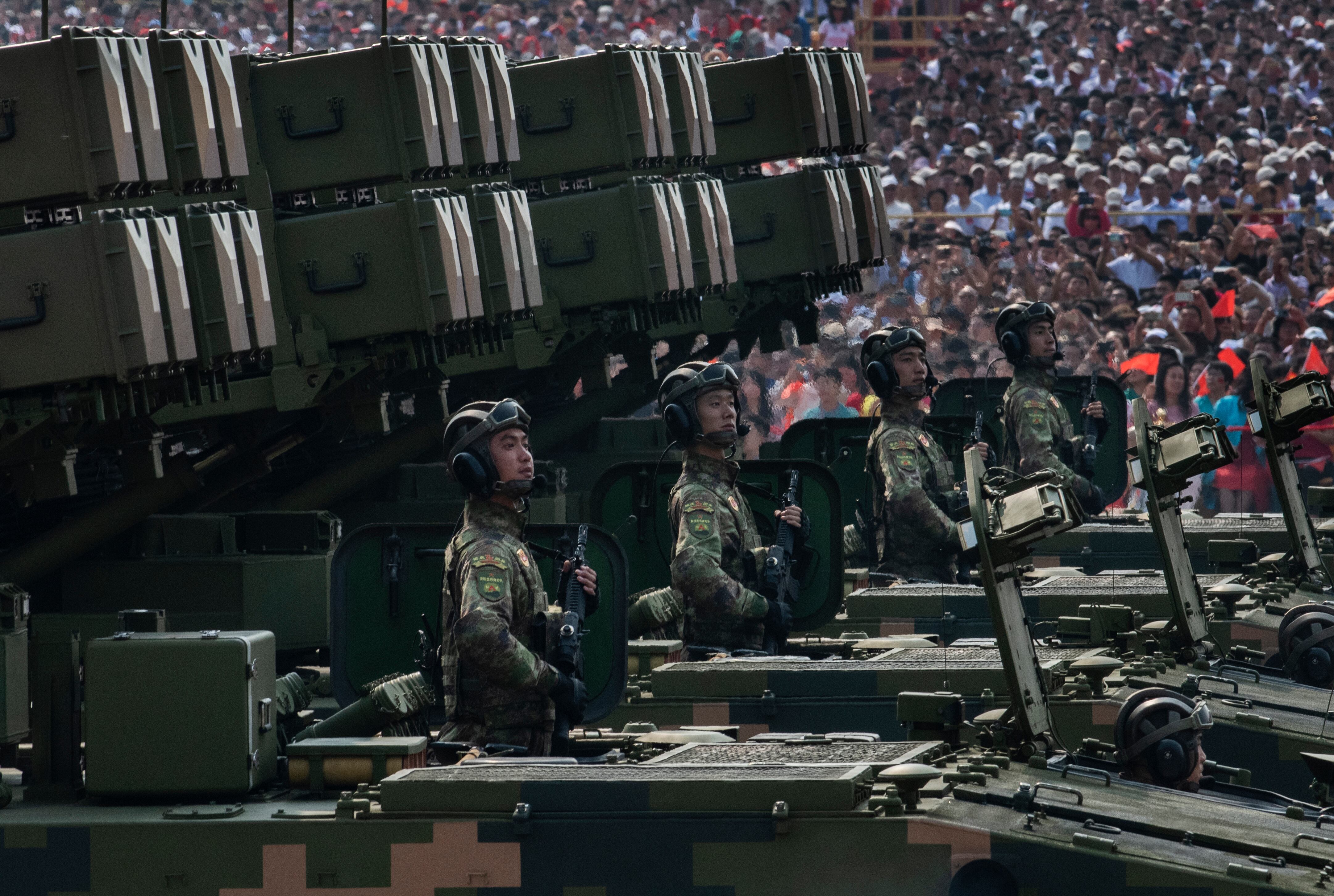 Chinese President Xi Jinping drives in a Hong Qi car after inspecting the troops during a parade to celebrate the 70th anniversary of the founding of the People's Republic of China at Tiananmen Square in 1949, on Oct. 1, 2019, in Beijing, China. (Kevin Frayer/Getty Images)The WZ-8 made its debut at the parade. It's believed to be a high-speed platform capable of attaining supersonic flight. (Greg Baker/AFP via Getty Images)China’s state-run news agency Xinhua said the 16 DF-41 transporter-erector-launchers at the parade came from two brigades with the People’s Liberation Army Rocket Force. (Kevin Frayer/Getty Images)Planes from the Chinese People's Liberation Army Air Force fly in formation during a parade to celebrate the 70th anniversary of the founding of the People's Republic of China. (Wang He/Getty Images)Military vehicles carry DF-5B intercontinental ballistic missiles during a military parade at Tiananmen Square in Beijing on Oct. 1, 2019. (Greg Baker/AFP via Getty Images)The biggest surprise at the parade was the appearance of the DF-17 hypersonic glide vehicle. (Greg Baker/AFP via Getty Images)Military vehicles carry DF-31AG intercontinental ballistic missiles during a military parade at Tiananmen Square in Beijing. (Greg Baker/AFP via Getty Images)Planes from the Chinese People's Liberation Army Air Force fly in formation during a parade in Beijing, China. (Wang He/Getty Images)Military vehicles carry DF-100 ground-based land-attack missiles. (Greg Baker/AFP via Getty Images)The Liaoning province float featured a giant winged robot (Greg Baker/AFP via Getty Images)Military vehicles carry HHQ-9B surface-to-air missiles through Tiananmen Square. (Greg Baker/AFP via Getty Images)An UAV is shown during the military parade for the 70th anniversary of the establishment of the People's Republic of China. (Andrea Verdelli/Getty Images)Chinese soldiers sit atop mobile rocket launchers as they drive in a parade to celebrate the 70th Anniversary of the founding of the People's Republic of China. (Kevin Frayer/Getty Images)Chinese soldiers shout as they march in formation. (Kevin Frayer/Getty Images)Chinese soldiers sit in small helicopters as they ride on trucks. (Kevin Frayer/Getty Images)Fireworks explode during China's Oct. 1, 2019, parade in Beijing. (Wang He/Getty Images)