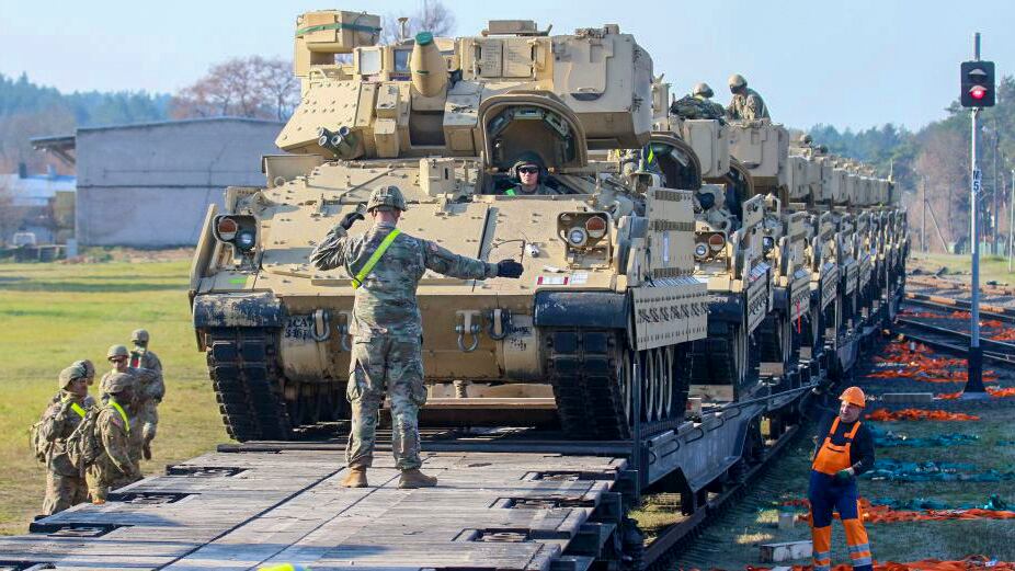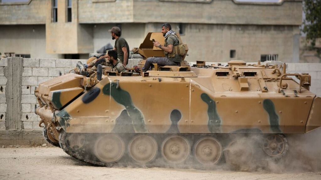 Members of the US Army's 1st Armored Battalion of the 9th Regiment, 1st Division from Fort Hood in Texas sit on a Abrams battle tank after arriving at the Pabrade railway station some 50 km (31 miles) north of the capital Vilnius, Lithuania, Monday, Oct. 21, 2019. The U.S. military says it's preparing a massive exercise early next year in Europe involving 20,000 soldiers from the U.S., the largest deployment across the Atlantic for training in more than 25 years. (AP Photo/Mindaugas Kulbis)Syrian Kurds, one of them carrying a Kurdish YPG (People's Protection Units) flag, watch as a US military vehicle drives on a road after US forces pulled out of their base in the Northern Syrian town of Tal Tamr, on October 20, 2019. - US forces withdrew from a key base in northern Syria today, a monitor said, two days before the end of a US-brokered truce to stem a Turkish attack on Kurdish forces in the region. (DELIL SOULEIMAN/AFP via Getty Images)An armoured personnel carrier transports Turkey-backed Syrian fighters on the road between the Syrian towns of Tal Abyad and Kobane on the Turkish border on October 16, 2019 as Turkey and its allies continue their assault on Kurdish-held border towns in northeastern Syria. - (Photo by BAKR ALKASEM/AFP via Getty Images)Members of the US Army 1st Division 9th Regiment 1st Battalion unload heavy combat equipment including Abrams tanks and Bradley fighting vehicles at the railway station near the Pabrade military base in Lithuania, on October 21, 2019. - The United States on October 21, 2019 began deploying a battalion of troops and dozens of tanks to Lithuania for an unprecedented six-month rotation, a move sought by the Baltic EU and NATO state to deter neighboring Russia.
