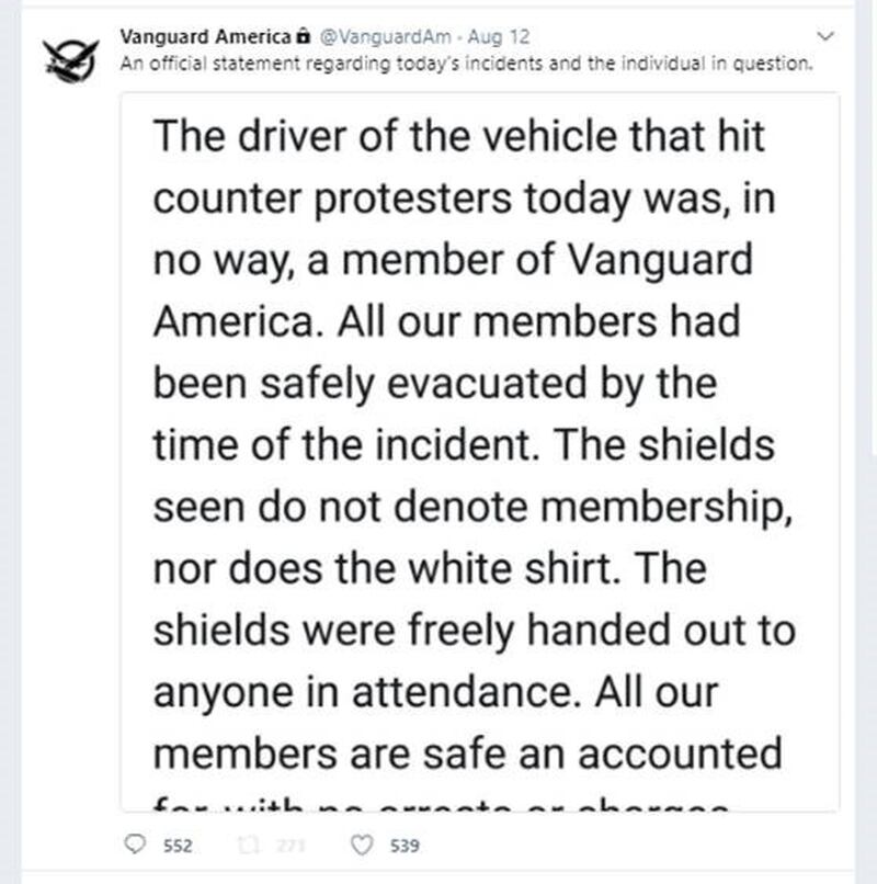 Vanguard America posted a statement on Twitter stating that all of its “members had been safely evacuated by the time of the incident.”