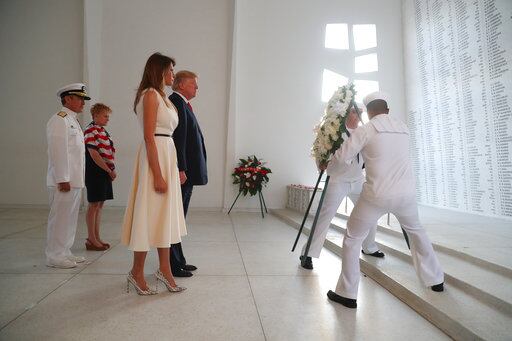 Trump saluted after entering the memorial following a short boat ride with first lady Melania Trump. They approached a wreath of white flowers — a gift from the couple — and watched as two sailors who stood beside it at attention placed the wreath near a wall of names of the fallen.