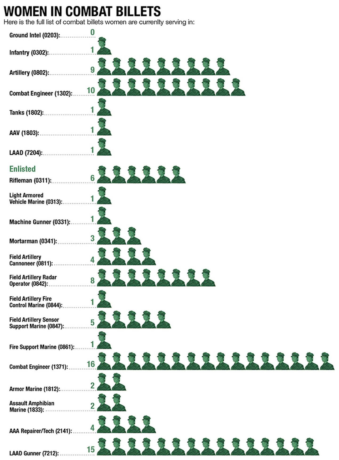 Of the women serving in combat billets, most of them are in less physically demanding roles such as light air defense and artillery, commonly referred to as a non-load bearing job field, according to data obtained by Marine Corps Times.