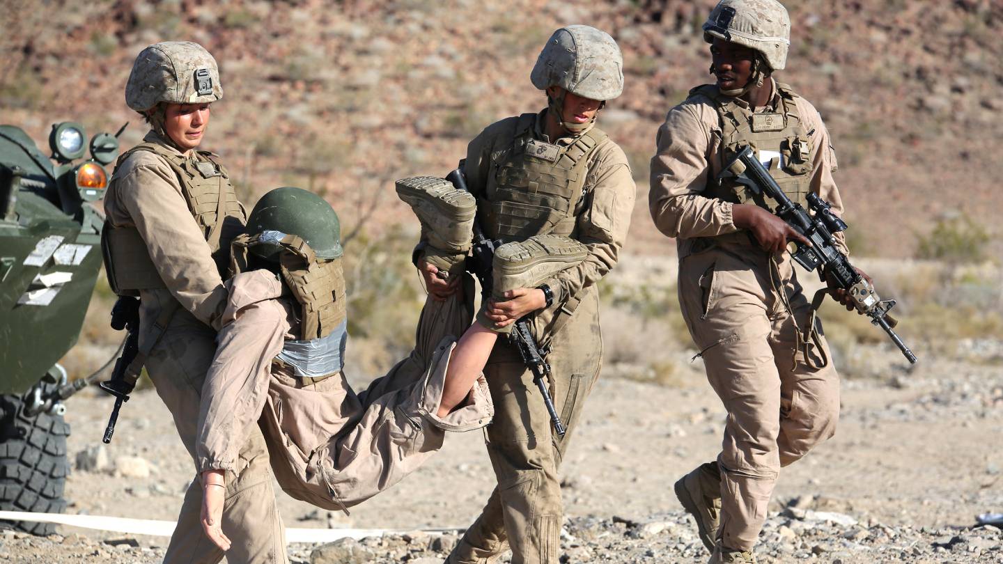 Lance Cpls. Brittany Dunklee, left, and Ashleigh Howell, center, carry a simulated casualty during the Marine Corps' women-in-combat experiment in California.