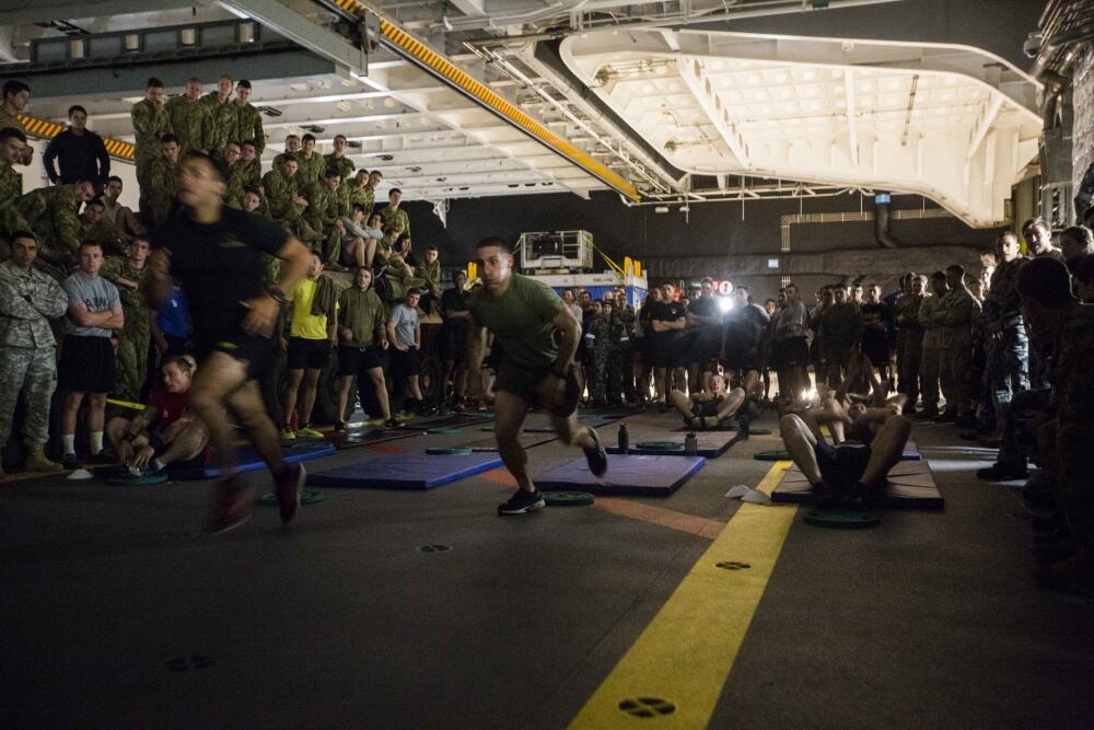 Marines, soldiers and Australian sailors and soldiers compete in a fitness challenge while aboard an Aussie ship.