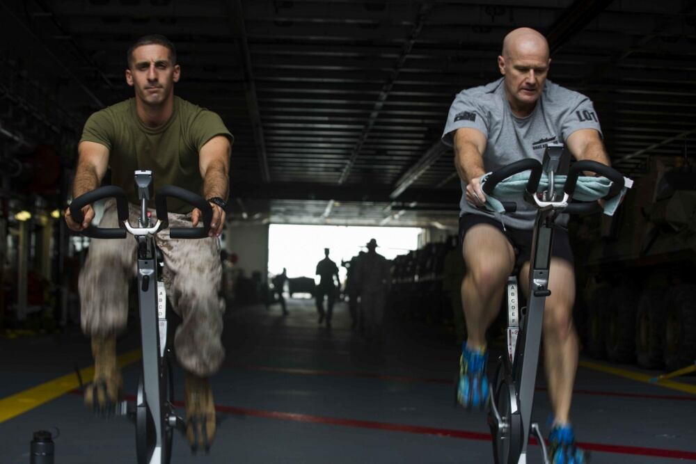 Marine Staff Sgt. Joseph Iadarola, a platoon sergeant, and an Australian warrant officer participate in a cycling competition while at sea.