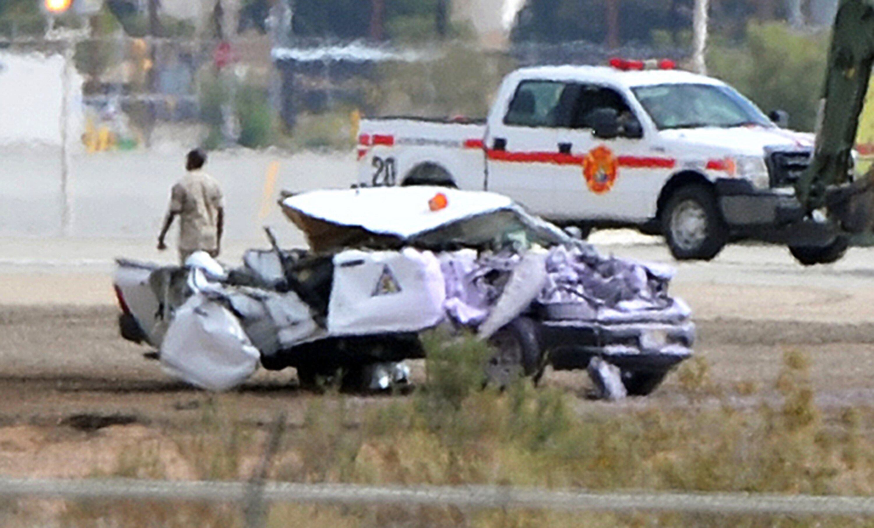 A crashed vehicle sits alongside a runway where a T-59 Hawk aircraft crashed at Marine Corps Air Station in Yuma, Ariz., in March 2015. Lance Cpl. Anthony DuBeau, who was in the truck at the time, was killed in the accident.