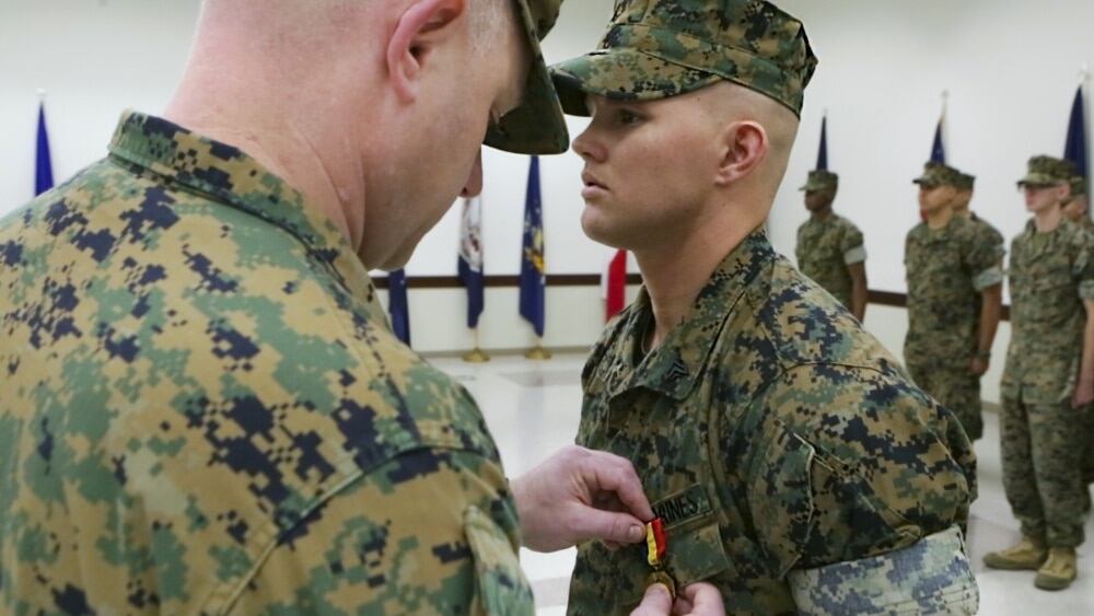 A Marine Corps corporal was awarded the service's highest honor for non-combat valor for saving a man's life in a car crash in North Carolina in 2014.