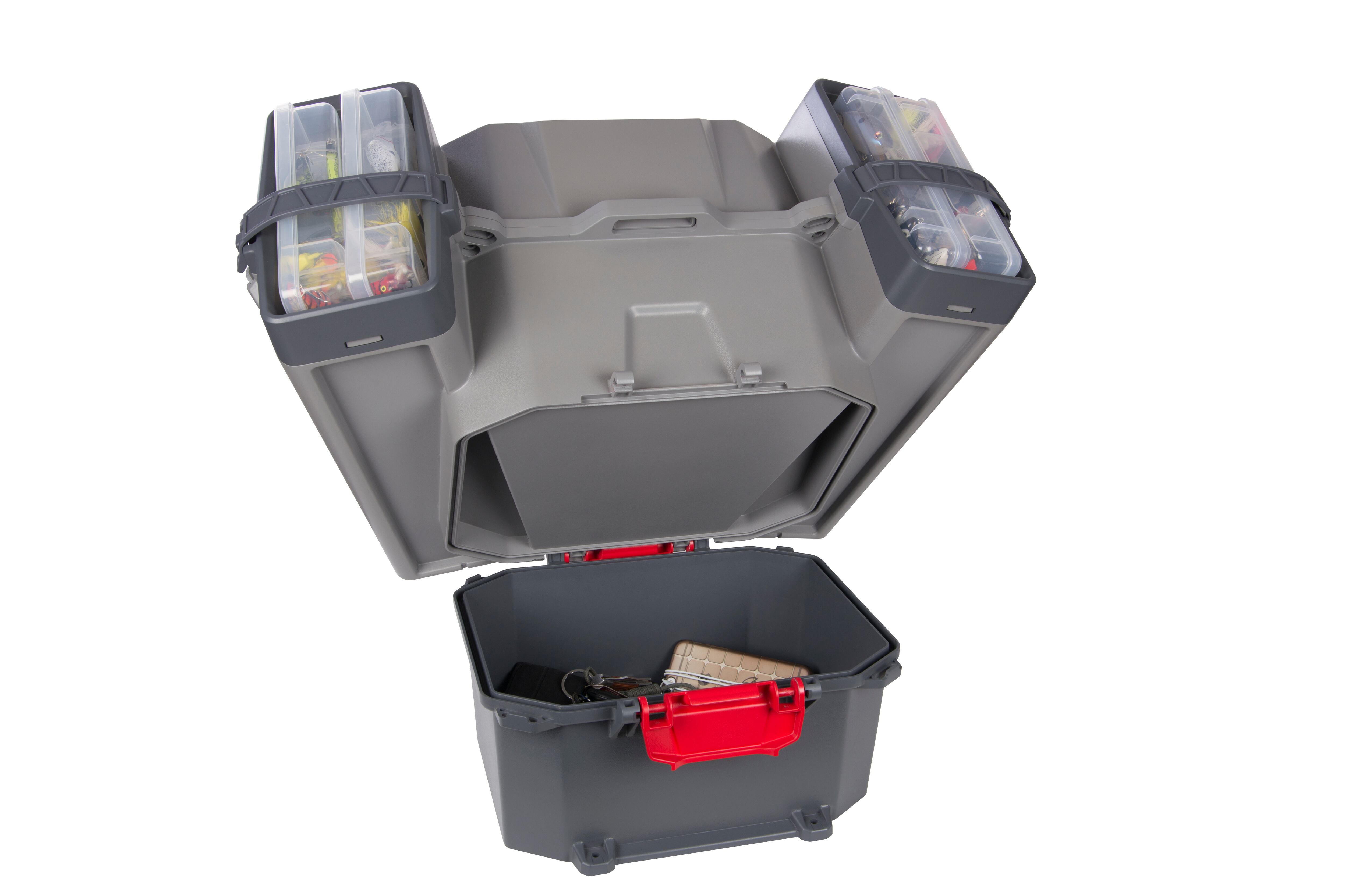 Flambeau Outdoors teams with Bassmaster Elite’s Mike Iaconelli in this updated, customizable tackle tray that features anti-corrosive, Zerust-treated removable boxes. Many tackle trays have partitions that fit into slots; this tray has divider boxes in four sizes. Use them to fill the entire tray or leave some out to create larger spaces for items like pliers, bags of soft plastics extra-large lures and line spools.