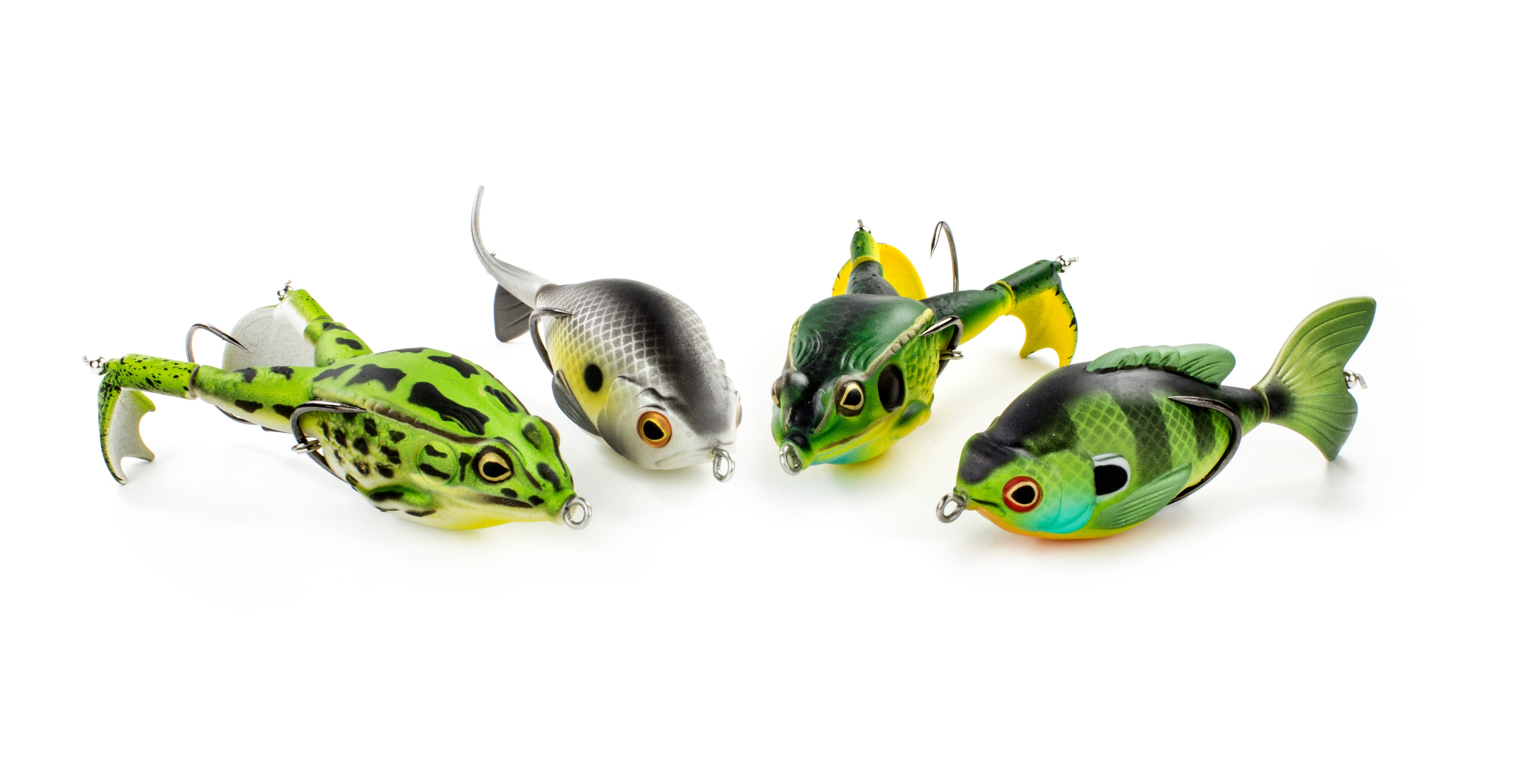 The series features The Prop Frog, Prop Fish Sunfish and Prop Fish Shad. All lures splash and gurgle on the retrieve and float during any pauses. The Prop Frog is designed to churn water over open pockets. The feet are harder plastic and spin through the water. It comes in eight color patterns.