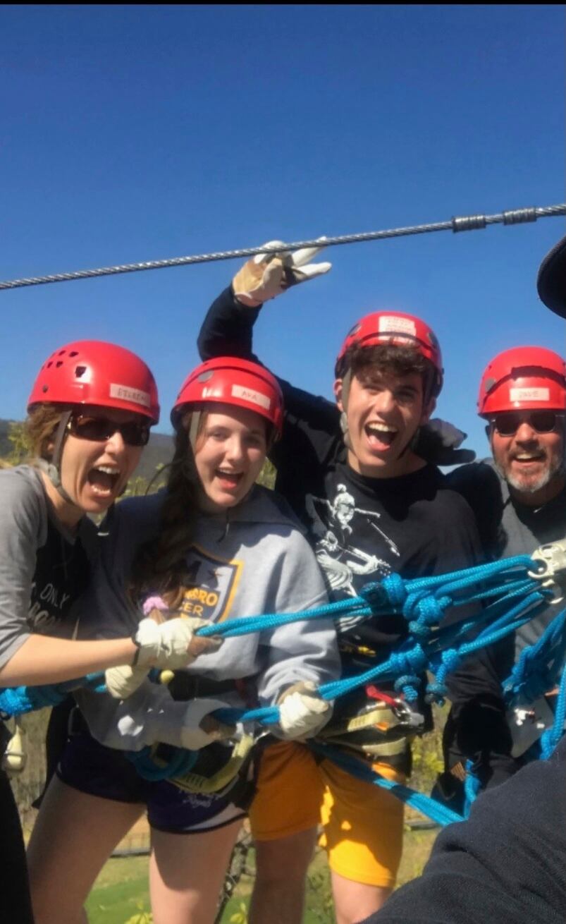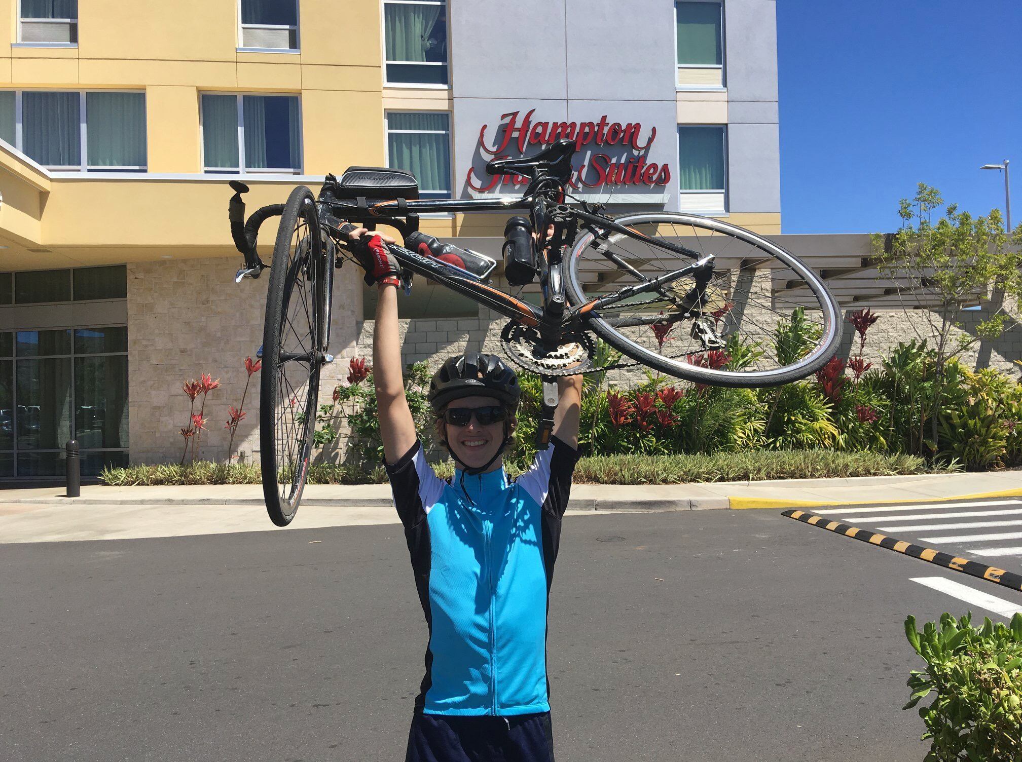 He spent his first day of high school in an infusion chair in the oncology wing of Valley Children’s Hospital in California. At age 16, a year after completing treatment, and following several scans showing no evidence of cancer, Caleb and his father rode around the island of Oahu on a 135-mile, three-day bike ride. “I was blessed to have a full recovery,” he said. The last day of the bike ride, his friends came to congratulate him.