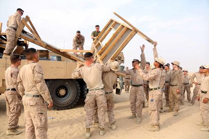 U.S. Marines with 1st Battalion, 7th Marine Regiment, Special Purpose Marine Air-Ground Task Force-Crisis Response-Central Command, remove target stands for a stress fire range in the Middle East, July 5, 2017. The stress fire range is designed to increase the Marines’ capabilities of firing their weapon accurately under pressure. (Lance Cpl. Joshua S. McAlpine/Marine Corps)