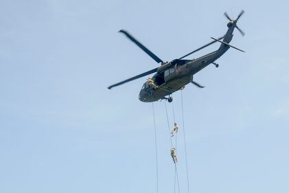Soldiers with Fort Indiantown Gap's inaugural Air Assault course rappel from a UH-60 Black Hawk helicopter operated by pilots from the Eastern Army National Guard Aviation Training Site July 20, 2017. (Sgt. Zane Craig/Army)