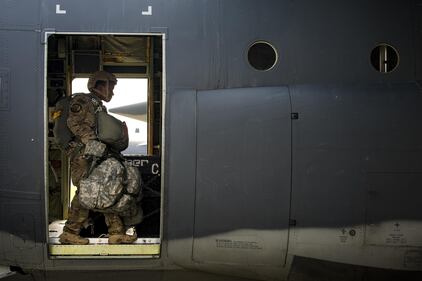 An Airman from the 820th Base Defense Group walks past the crew door in an HC-130J Combat King II, July 14, 2017, at Moody Air Force Base, Ga. (/Staff Sgt. Ryan Callaghan/Air Force)