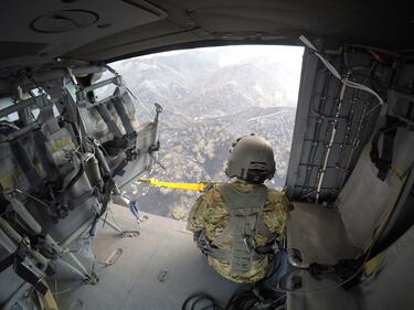 Sgt. Bob Batham of the California Army National Guard’s 1st Battalion, 140th Aviation Regiment, watches smoke and charred hills from the Garza Fire at Tar Canyon Road, Kings County, California. Five CalGuard UH-60 Black Hawks responded to the wildfire that consumed more than 40,000 acres and still actively progressing as of July 14. (Staff Sgt. Eddie Siguenza/Army National Guard)