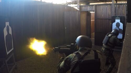 An Uraguayan competitor fires his weapon during a simulated hostage rescue mission July 22, 2017, during Fuerzas Comando in Cerrito, Paraguay. (Pfc. Lauren Sam/Army)