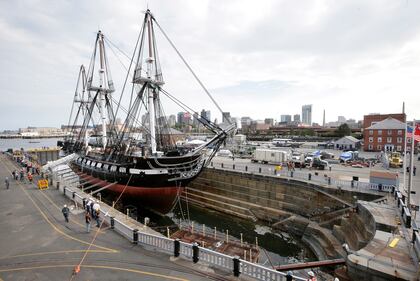 The USS Constitution, also known as Old Ironsides, rests in dry dock as water enters the basin to refloat the vessel Sunday, July 23, 2017, at Charlestown Navy Yard in Boston. The world's oldest commissioned warship afloat has undergone over two years of restoration in dry dock. (Steven Senne/AP)
