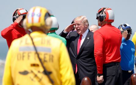 President Donald Trump salutes as he walks to board Marine One on the flight deck of the USS Gerald R. Ford (CVN 78) at Naval Station Norfolk, Va., Saturday, July, 22, 2017, after the commissioning ceremony of the aircraft carrier. (Carolyn Kaster/AP)