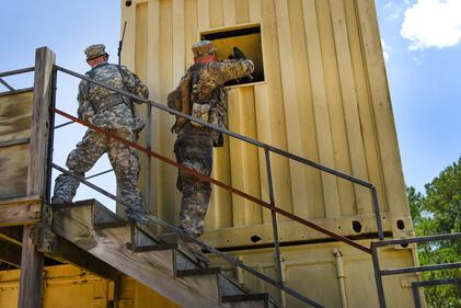 South Carolina Army National Guard members search a building before breaching a room during the Spur Ride at McCrady Training Center in Eastover, S.C., July 14, 2017. (Spc. Chelsea Baker/Army National Guard)