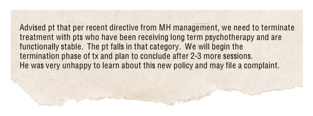 He was furious when his psychologist told him of a recent directive from management, spelled out in Robert’s medical notes: “We need to terminate treatment with pts [patients] who have been receiving long-term psychotherapy and are functionally stable.”