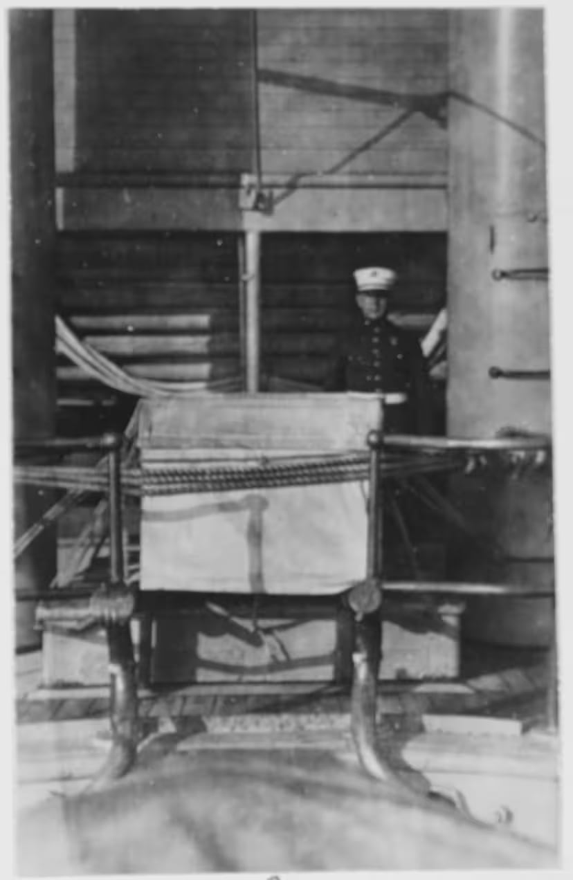 A U.S. Marine stands guard over the Unknown Soldier lashed down aboard the Olympia in 1921. (Naval History and Heritage Command)