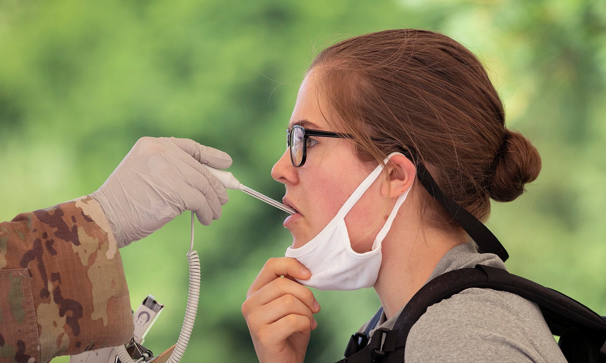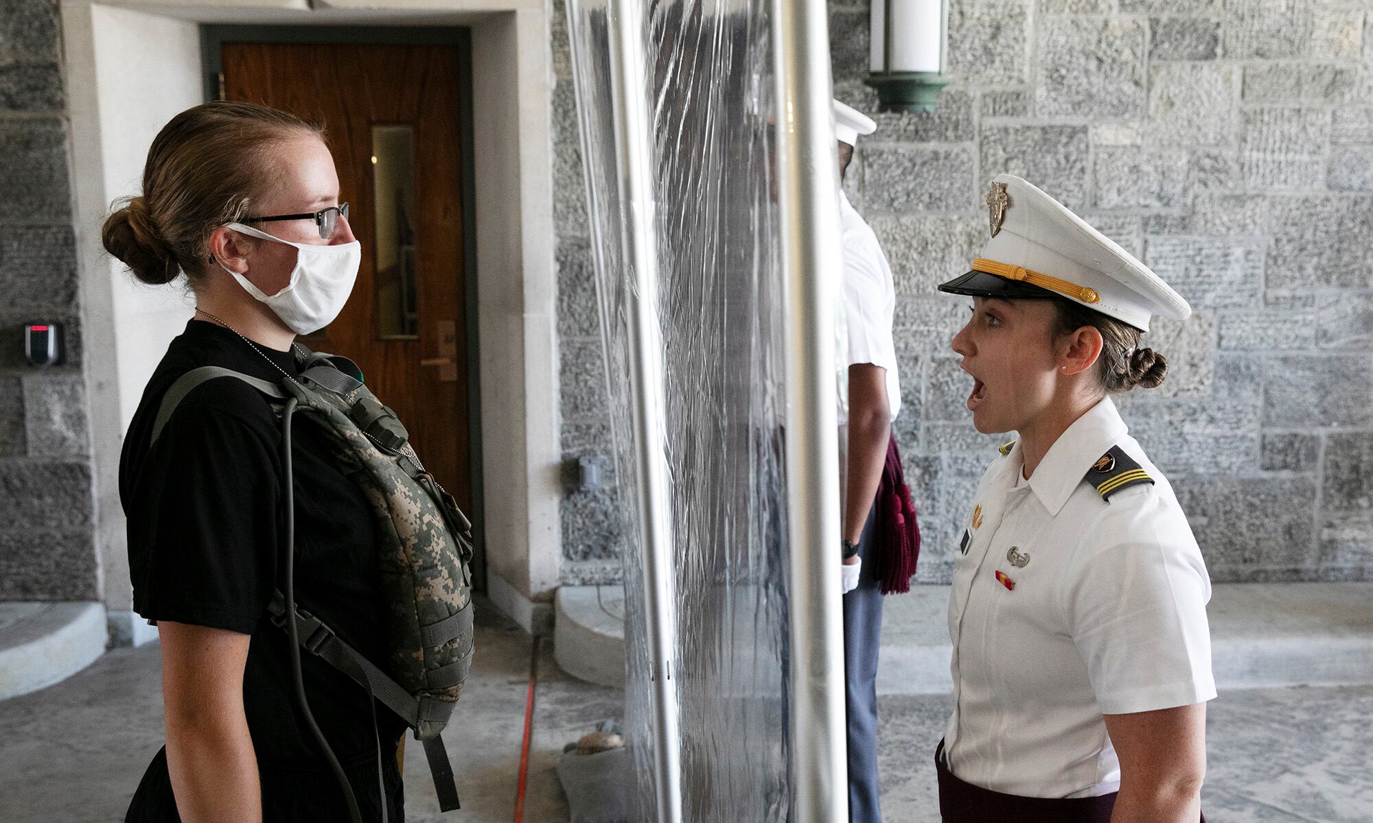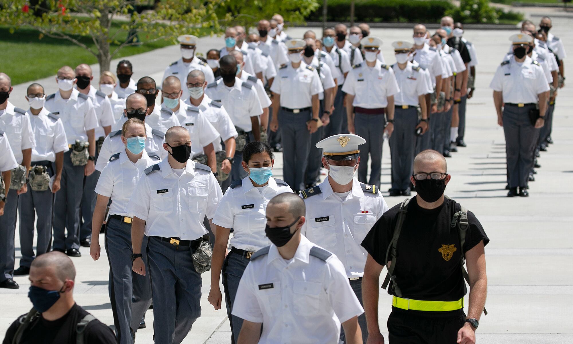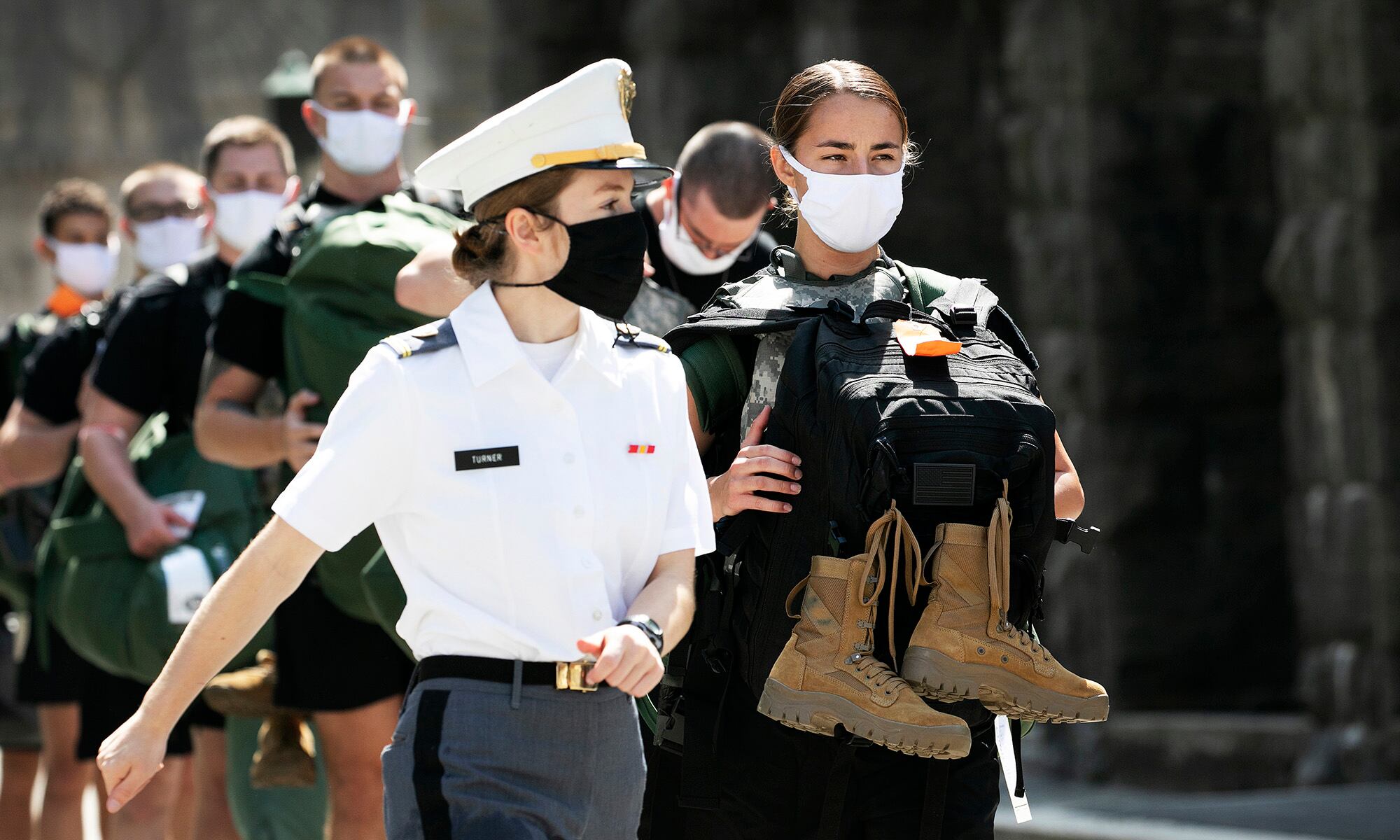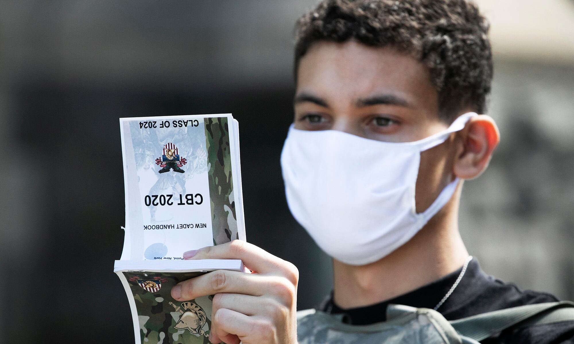 Cadet candidate Daphne Karahalios, of Chicago, has her temperature taken as she arrives at the U.S. Military Academy on July 13, 2020, in West Point, N.Y. The Army is welcoming more than 1,200 candidates from every state. Candidates will be COVID-19 tested immediately upon arrival, wear masks, and practice social distancing. (Mark Lennihan/AP)A formation of new cadets marches on July 13, 2020, at the U.S. Military Academy in West Point, N.Y. The Army is welcoming more than 1,200 candidates from every state. Candidates will be COVID-19 tested immediately upon arrival, wear masks, and practice social distancing. (Mark Lennihan/AP)Noah Petty, of Boise, Idaho, has his hair cut by Jeanine Jennings on his first day at the U.S. Military Academy on July 13, 2020, in West Point, N.Y. The Army is welcoming more than 1,200 candidates from every state in the nation. Candidates will be COVID-19 tested immediately upon arrival, wear facial coverings, and practice social distancing. (Mark Lennihan/AP)A West Point cadet, right, leads a formation of new cadets on July 13, 2020, at the U.S. Military Academy in West Point, N.Y. The Army is welcoming more than 1,200 candidates from every state. Candidates will be COVID-19 tested immediately upon arrival, wear masks, and practice social distancing. (Mark Lennihan/AP)A new cadet, left, listens as First Class Cadet Madison Teague, right, yells commands as a plastic screen separates them at the U.S. Military Academy on July 13, 2020, in West Point, N.Y. The Army is welcoming more than 1,200 candidates from every state. Candidates will be COVID-19 tested immediately upon arrival, wear masks, and practice social distancing. (Mark Lennihan/AP)New cadets march in formation on July 13, 2020, at the U.S. Military Academy in West Point, N.Y. The Army is welcoming more than 1,200 candidates from every state. Candidates will be tested for COVID-19 immediately upon arrival, wear masks, and practice social distancing. (Mark Lennihan/AP)A West Point cadet leads a formation of new cadets on July 13, 2020, at the U.S. Military Academy in West Point, N.Y. The Army is welcoming more than 1,200 candidates from every state. Candidates will be COVID-19 tested immediately upon arrival, wear masks, and practice social distancing. (Mark Lennihan/AP)A West Point cadet reads the New Cadet Handbook on his first day at the U.S. Military Academy on July 13, 2020, in West Point, N.Y. The Army is welcoming more than 1,200 candidates from every state. Candidates will be COVID-19 tested immediately upon arrival, wear masks, and practice social distancing. (Mark Lennihan/AP)